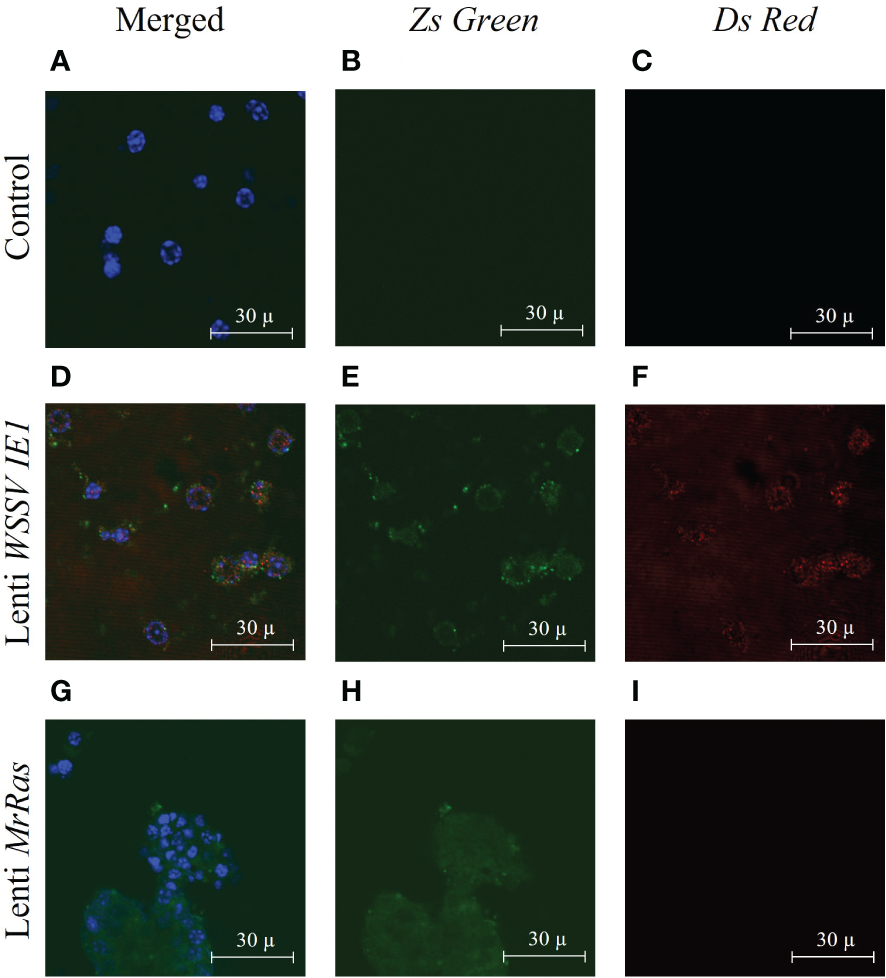 Expression of lentiviral particles in M. rosenbergii embryonic primary cell culture three days after transduction, as seen by confocal microscopy: (A-C) Representative images of control non-transduced cells, (D-F) Lenti WSSV IE1 transduced cells, and (G-I) mutated lenti MrRas transduced cells. Cultures were examined by confocal microscopy (using the appropriate lasers, 488 nm for ZsGreen and 546 nm for DsRed). The ‘Merged’ panel (A, D, G) on the left of the Figure shows additional nucleic acid staining performed with DAPI (and visualized with a 405 nm laser). Scale bar = 30 µm.
