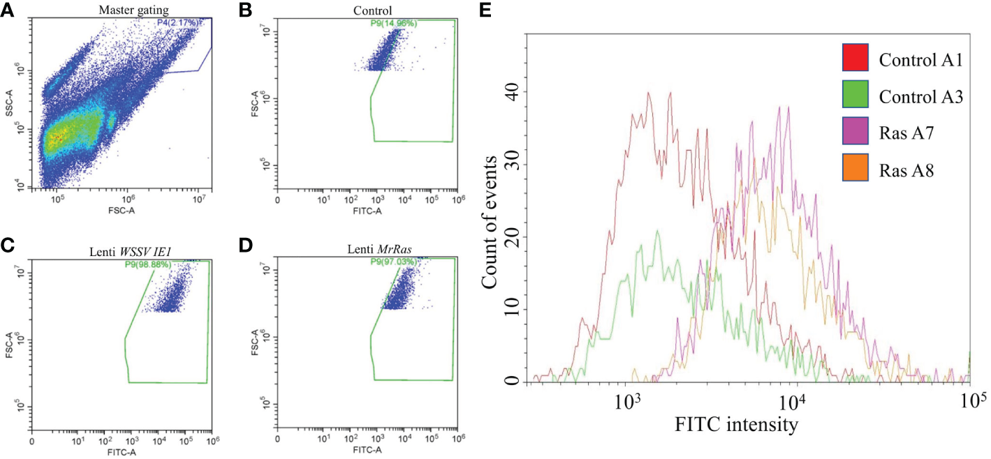 Depiction of a sub-population of cells exhibiting a higher rate of transduction. (A) The primary scatter plot shows entire events analyzed in control cells, gating on a specific population based on granularity and larger cell size. (B) FITC signal of the control cells expressed innate autofluorescence. (C) FITC signal of the positive control plasmid lenti WSSV IE1 transduced cells. (D) FITC signal of the mutated lenti MrRas transduced cells. (E) The traces for the positively transduced cells for FITC (purple and orange traces) were overlaid over the traces for the control (red and green).