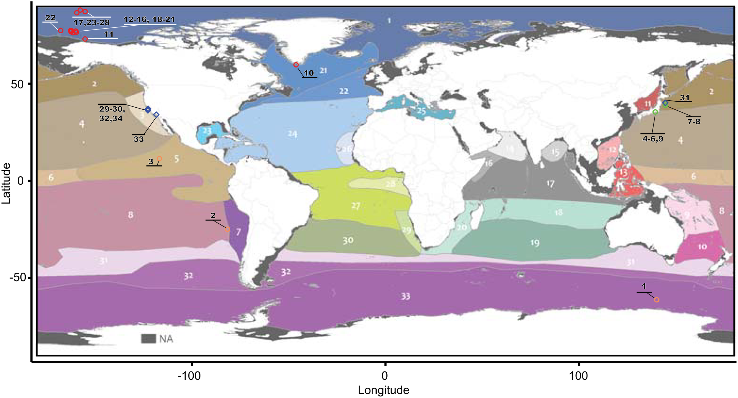 Geographical distribution by ecoregions of the samples analyzed in this study. Circles correspond to specimens of the genus Botrynema, and blue diamonds correspond to the genera Haliscera, Halitrephes and Halicreas in the family Halicreatidae. The ecoregion map was modified from Sutton et al. (2017). Numbers in black represent unique specimens as indicated in Supplementary Table 1.