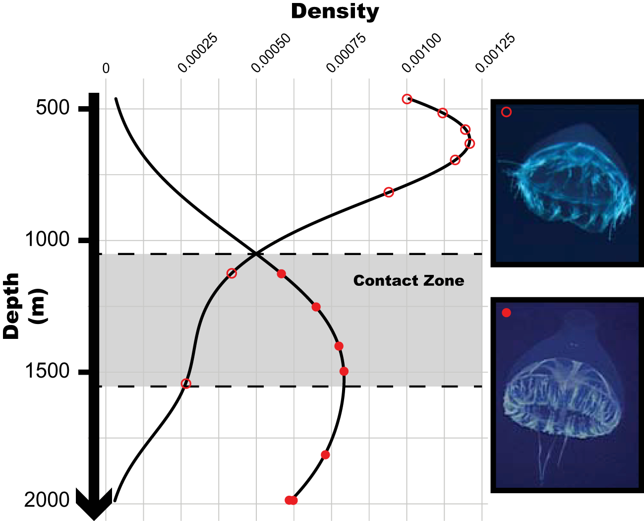Density distribution plot for the recorded depths of occurrence of Botrynema in the Arctic Ocean during Cruise HLY16-01 of the U.S. Coast Guard Cutter (USCGC) Healy between 2 July to 10 August 2016. Empty circles indicate records for B. brucei ellinorae comb. nov. without an apical knob, and full circles records for B. brucei ellinorae comb. nov. with a knob.