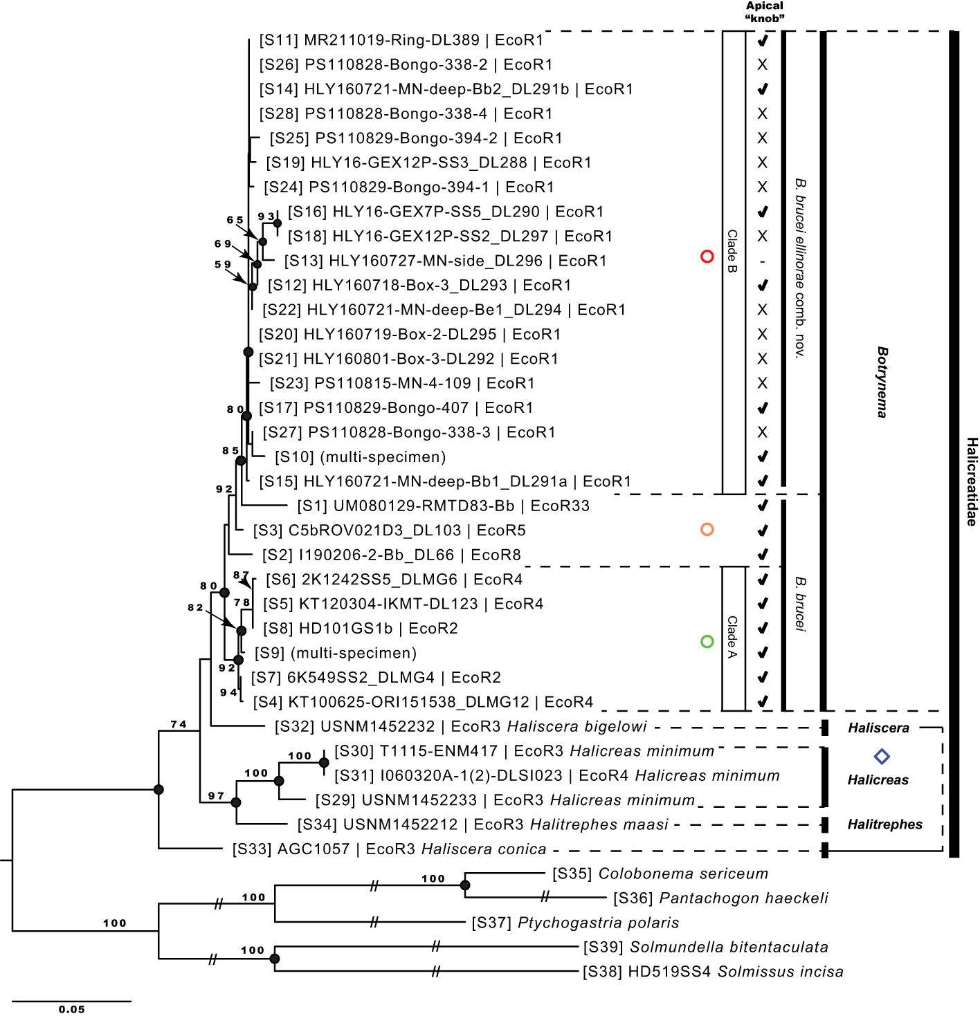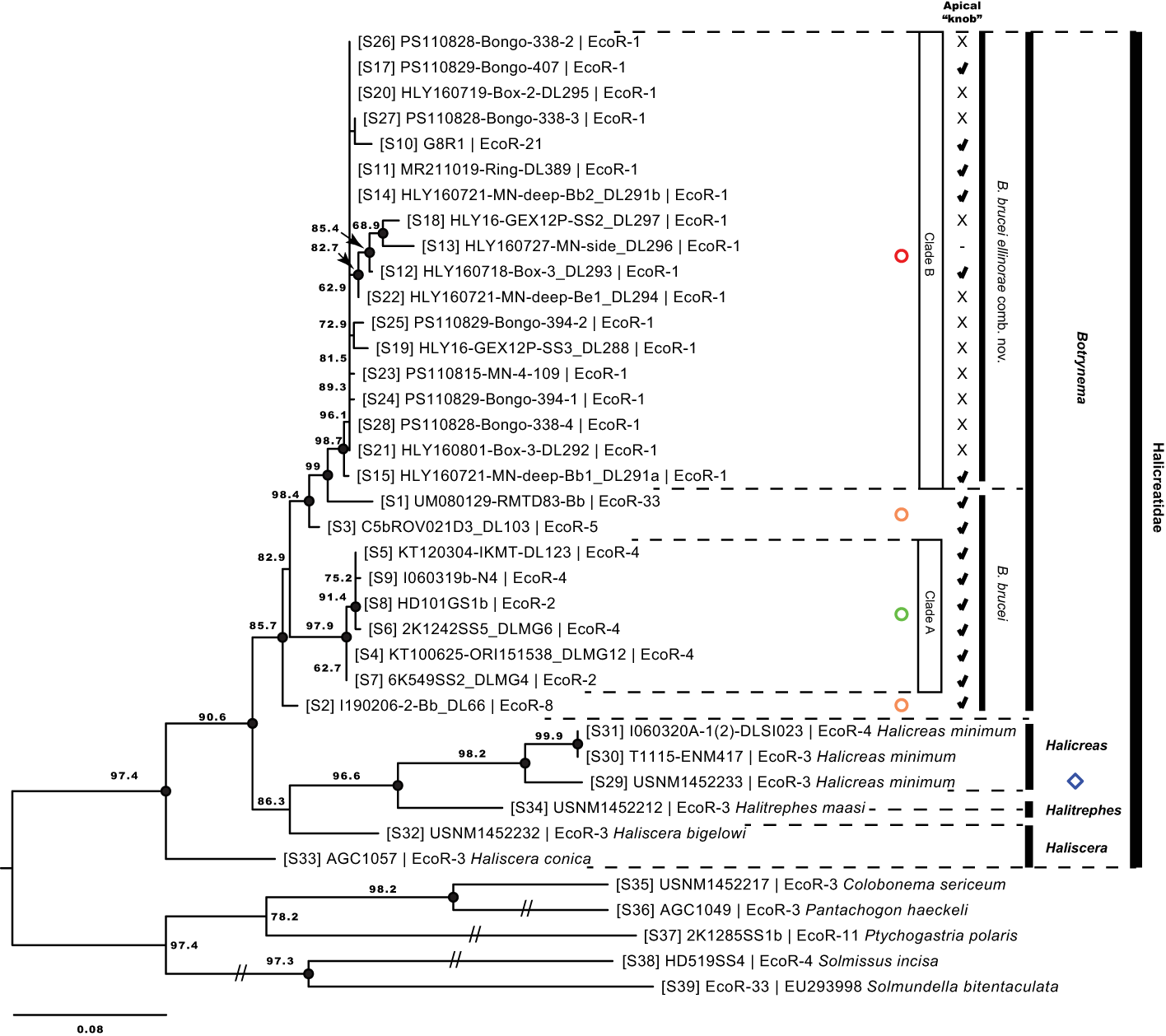 Maximum likelihood phylogenetic reconstruction based on the 16S-rDNA region. Values on branch nodes indicate likelihood bootstrap support over 50%. Full black circles on branch nodes represent Bayesian posterior probability support over 95%. Diamonds correspond to the genera Haliscera, Halitrephes and Halicreas in the family Halicreatidae. Circles refer to the genus Botrynema, in green Clade A, red Clade B, and in orange single lineages not corresponding either to Clade A nor B Numbers in brackets are concordant with the “S#” in Supplementary Table 1, 2. Note how the presence/absence of an apical “knob” is variable across clade B – B brucei ellinorae comb. nov. (see Figure 5).