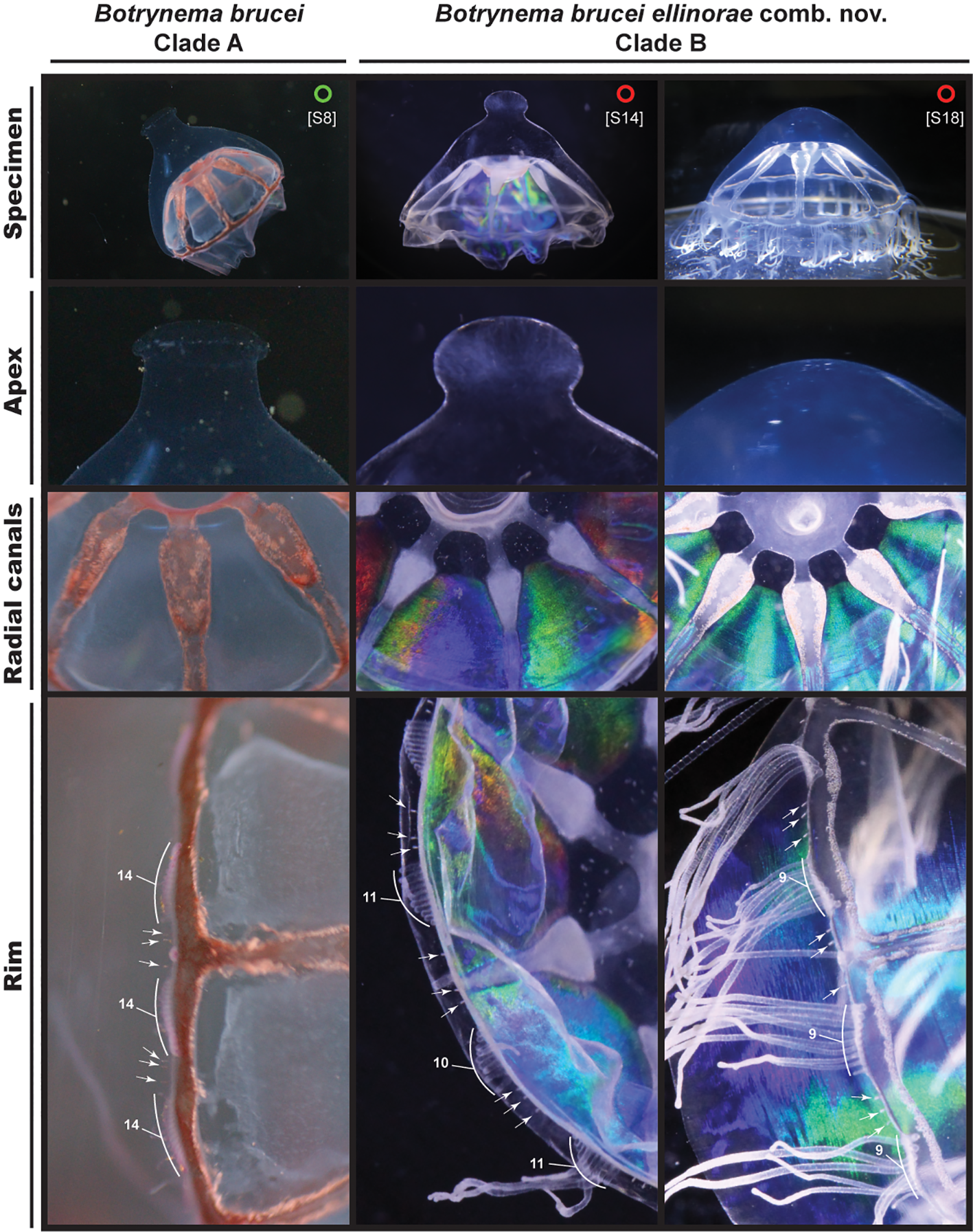 Comparison between specimens of B brucei and B brucei ellinorae comb. nov. Circles refer to specimens of Botrynema within Clade A in green, and red for Clade B (Figures 3, 4). Note the clear differences in the shape of the apical knob, when present, between clades A and B White arrows show the location of statocyst and numbers indicate the number tentacles per octant.
