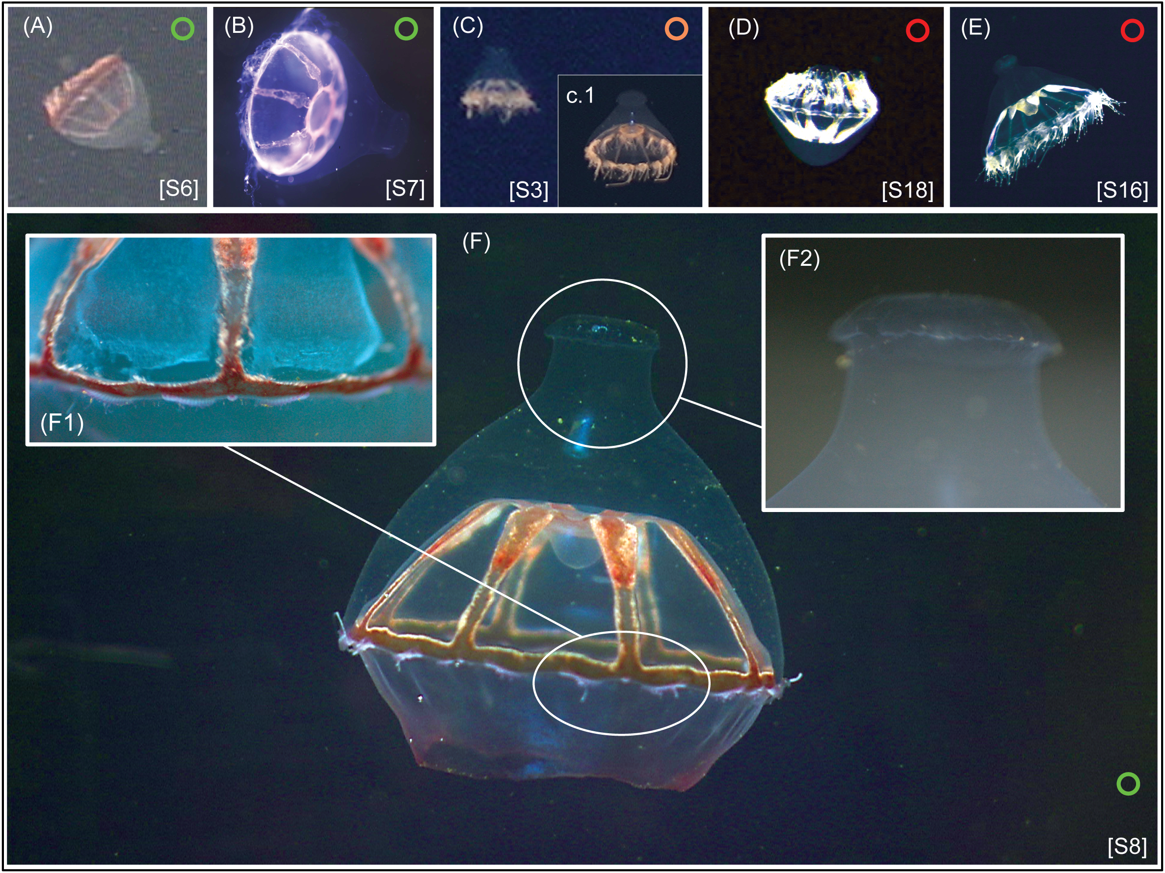 In-vivo pictures of some of the specimens in the genus Botrynema analyzed in this study. Specimens belonging to Clade A are marked with a green circle, belonging to Clade B with a red circle, and specimens not included in either of the clades with an orange circle. Numbers in brackets are concordant with the “S#” in Supplementary Tables 1, 2. Note how Clade A (A, B, F) is exclusively comprised of specimens where the apical knob (F2) is present, while for specimens in Clade B (D, E) the presence/absence of the knob is variable. The images in frames (C) and (C1), belong to two different specimens recorded from the Clarion-Clipperton Zone on different expeditions; frame (c) corresponds to specimen [S3], while specimen (c.1) was recorded on campaign TMC5e, ROV dive OY030, date 2021-11-27 at 2086 m depth.