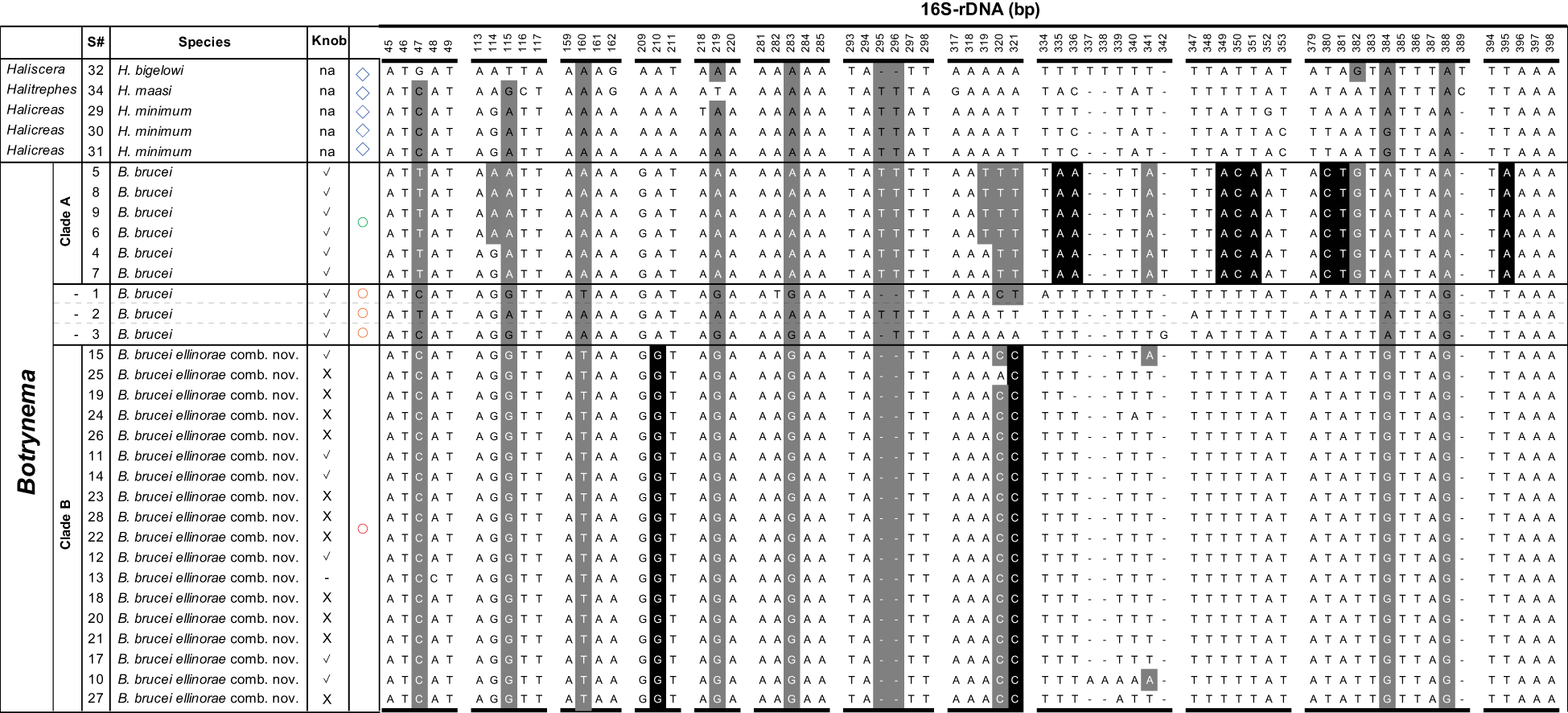 Differential molecular diagnosis between B brucei (Clade A) and B brucei ellinorae comb. nov. (Clade B) across the 16S-rDNA region. Nucleotide bases with a black background show substitutions unique to each clade within the family Halicreatidae. Bases with a grey background indicates polymorphic positions that are characteristic but not unique to any particular clade within the family Halicreatidae. Blue diamond symbols correspond to the genera Haliscera, Halitrephes and Halicreas in the family Halicreatidae. Circles refer to the genus Botrynema, in green Clade A, red Clade B, and in orange single genotypes not corresponding either to Clade A nor B Note how the presence/absence of an apical “knob” is variable across Clade B.