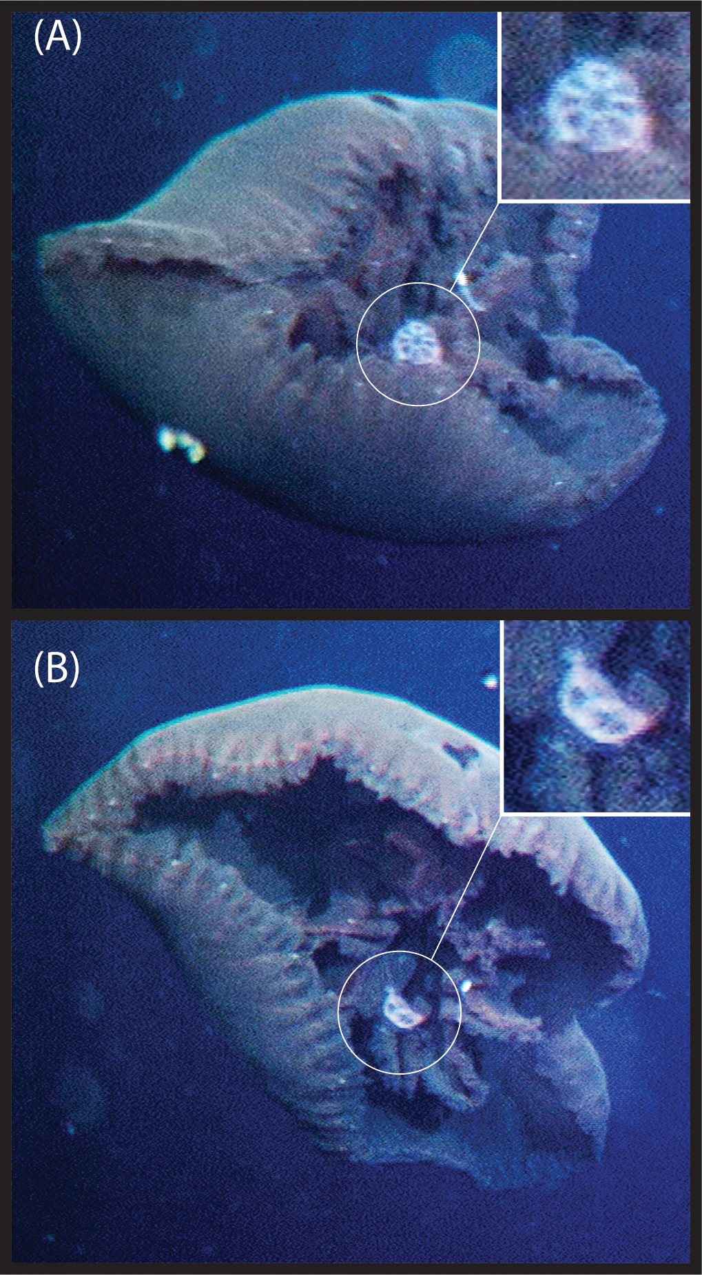 Whatever the function of the knob might be, it is interesting to note that most of the common predators of gelatinous zooplankton such as the narcomedusae, e.g. Solmissus, are prolific across most ecoregions (Raskoff, 2002; Lindsay and Hunt, 2005; Robison et al., 2010; Choy et al., 2017) but absent from shallower depths at higher latitudes (Raskoff et al., 2010) precisely the same depths where the B. brucei ellinorae comb. nov. morphotype without a knob occurs, and preferentially inhabiting between 461 m to 815 m (Figure 2). Furthermore, Bathykorus boullini, a narcomedusae and a major predator of gelatinous taxa in the Arctic, is known to be restricted to waters deeper than 1300 m and inhabit preferentially between 1400-2000 m, indeed the same depths inhabited by the B. brucei ellinorae comb. nov. morphotype with a knob. Figure 8 shows video framegrabs of Poralia rufescens, a scyphomedusa, foraging on Botrynema brucei at 1002 m depth in the Japan Trench, ecoregion 2 (Figure 1). Poralia rufescens is absent from the Arctic and known to inhabit between 500~1679 m depth (Lindsay et al., 2004; Hughes and Lindsay, 2017). Therefore, the vertical distribution of the genus Botrynema could be the result of niche displacement due to competition with other medusozoans, while the presence/absence of the knob could be determined by a differential regimen of selection by predation across ecoregions.