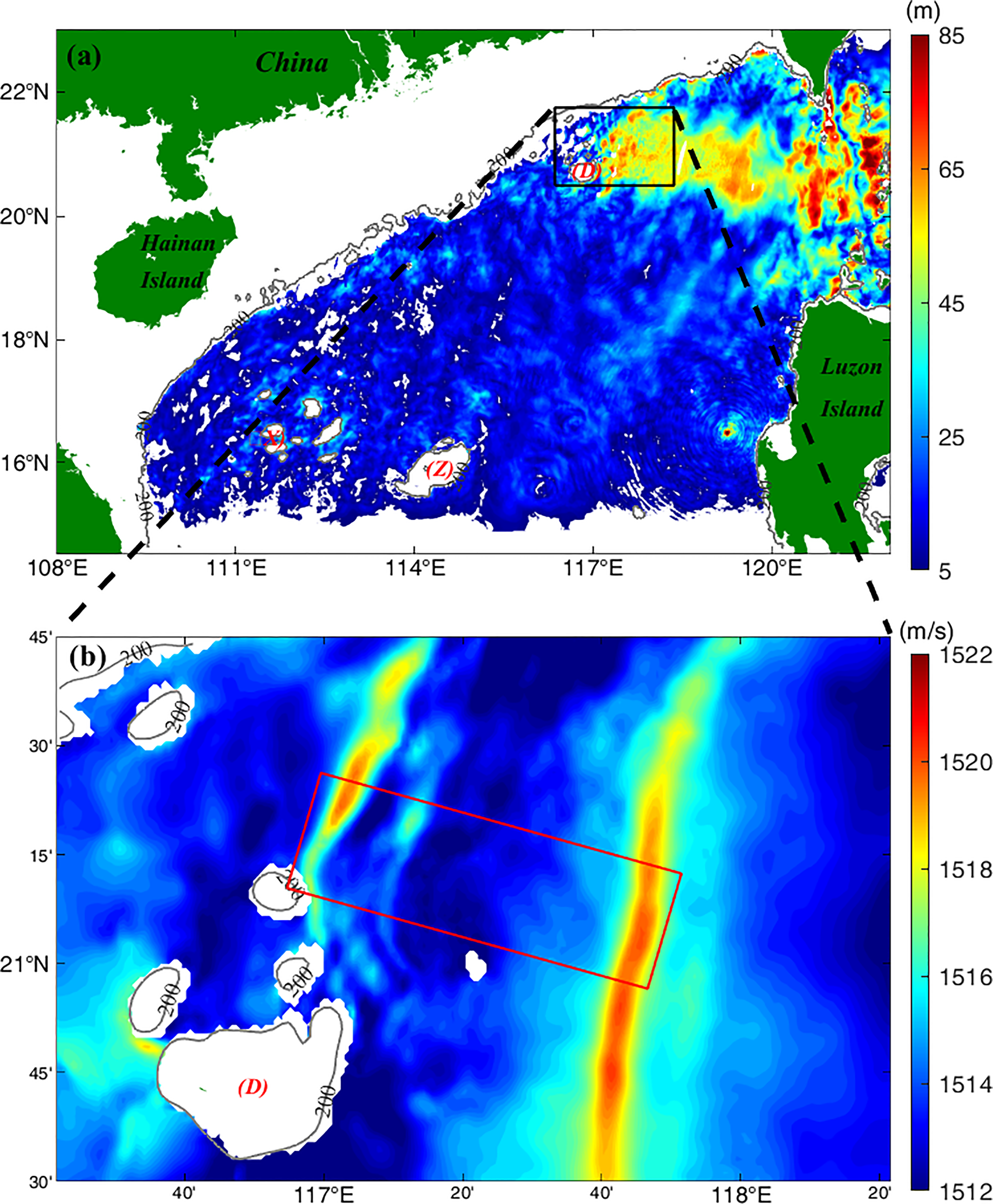 (A) Amplitude map of internal tides generated at hour 243 in the South China Sea during the application period of the SUNTANS model; (B) Magnified map of the area denoted by the black rectangle in (A) with color maps of sound speed at a depth of 200 m. The red rectangle represents the MCAT area. (D), (X), and (Z) indicate Dongsha, Xisha, and Zhongsha Islands, respectively.