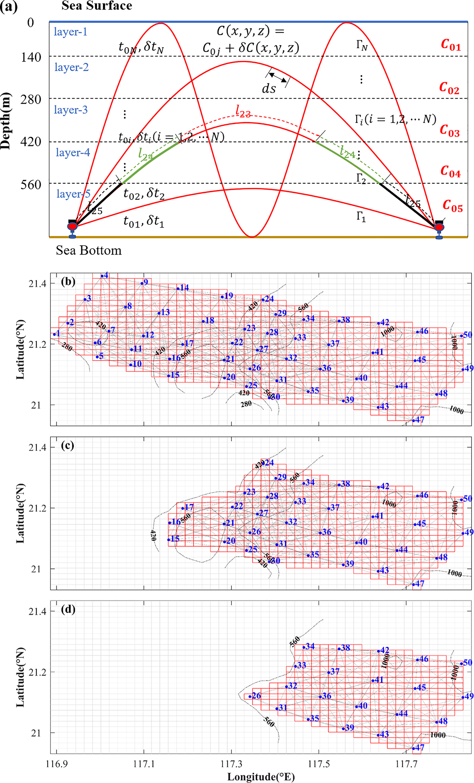Following the vertical-slice inversion in Kaneko et al. (2020), as shown in Figure 2A, we present an example to demonstrate the vertical-slice inversion for four rays and five horizontal layers. Range-average sound speed deviations are considered unknown variables between each station pair, which are need to be solved by the vertical-slice inversion. In this study, one-way travel times were simulated, and the effect of velocity on them was neglected as a suitable assumption. The one-way travel time along each ray path Γi is calculated as follows: