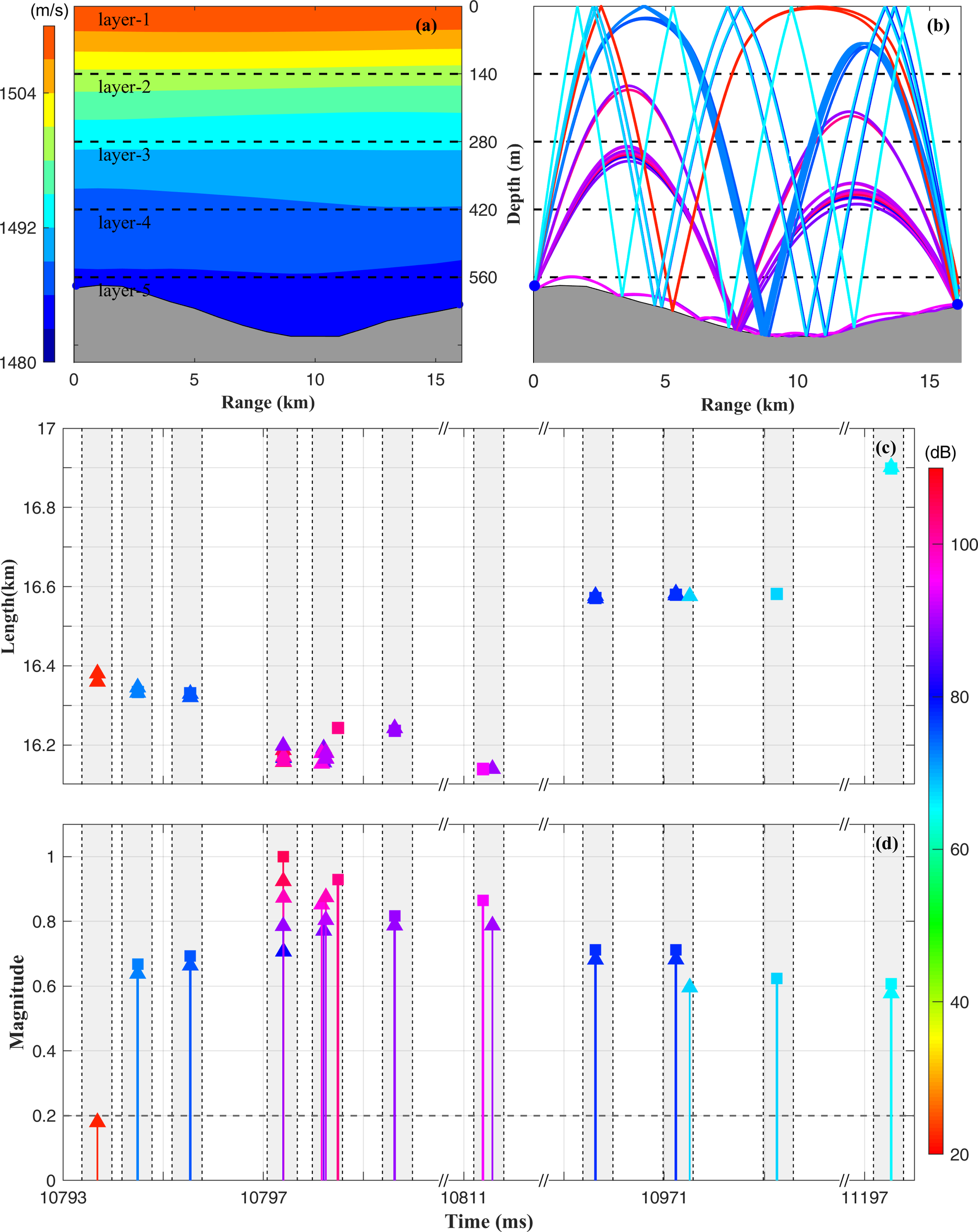 Ray simulation for the station pair C31–C33 at hour 243. (A) Contour map of the sound speed for the station pair C31–C33. (B) Eigenrays. (C) Ray arc length plotted against travel times. (D) Level of received sounds plotted against the travel time. The colors correspond to the sound level shown with color bar at the lower right. Shaded areas indicate the time bands for individual ray groups and the sound level is normalized using the maximum values.