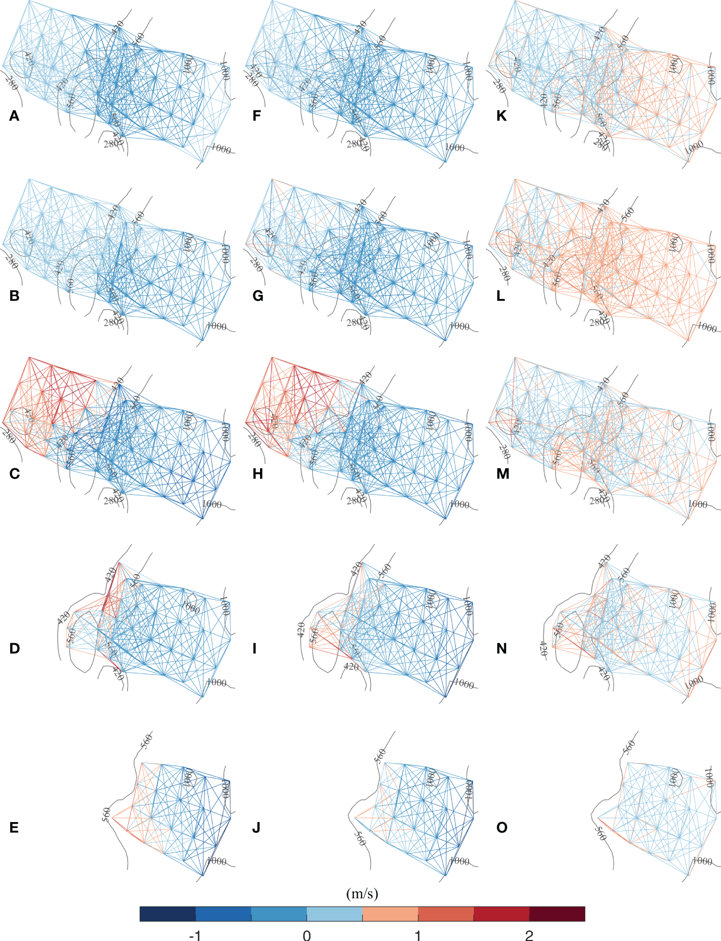 Results of the vertical-slice inversion. (A–E) Temporal plots of sound speed deviations calculated using the SUNTANS model along each transmission path. (F–J) Temporal plots of sound speed deviations derived from the vertical-slice inversion along each transmission path. (K–O) Temporal plots of RMSD calculated using the SUNTANS model and vertical-slice inversion. The first to fifth layers are from the top to bottom.