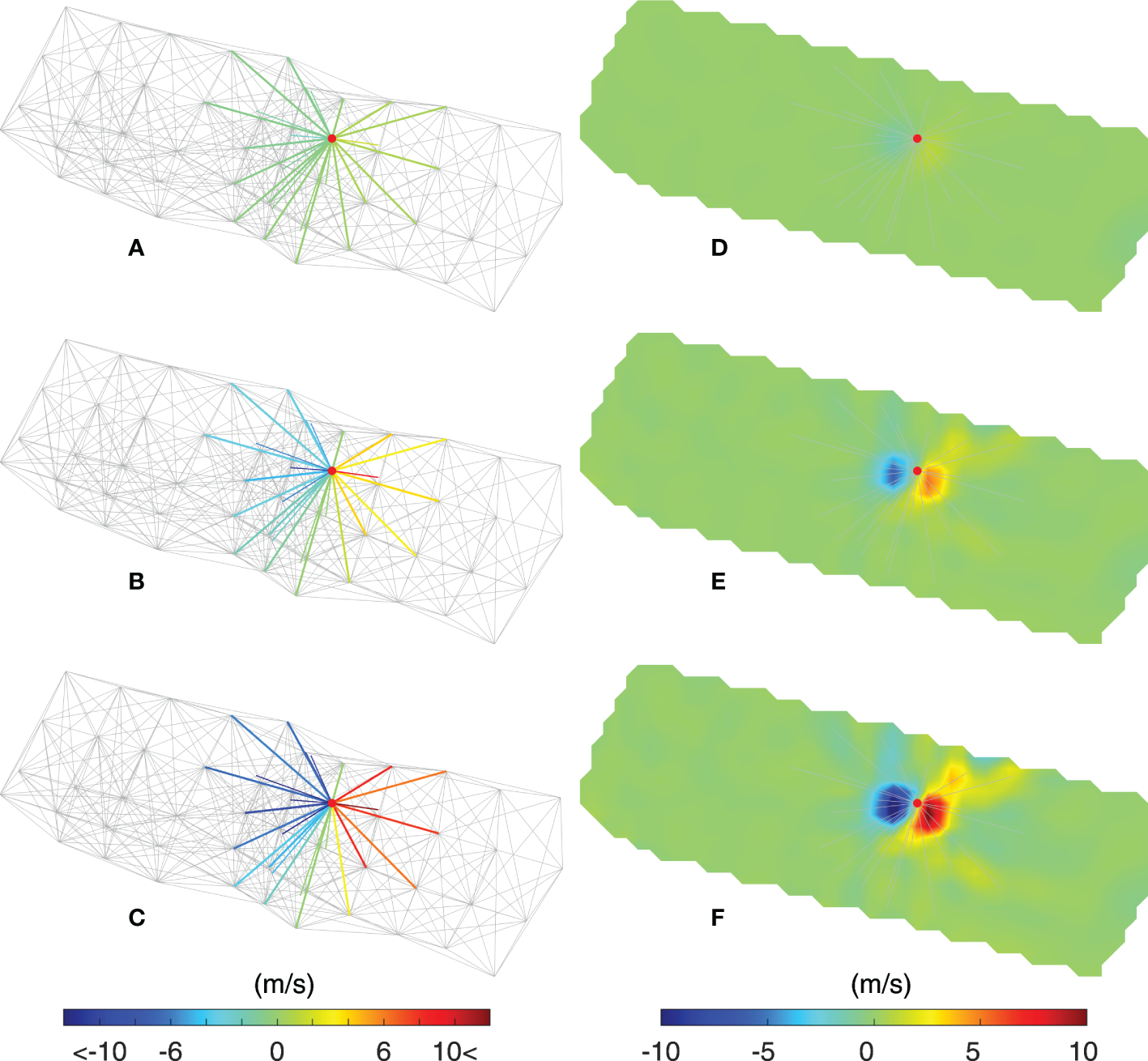 Results of the sensitivity experiments for station movement at hour 92. (A–C) Sound speed deviations generated by station movements of 10, 50, and 100 m at a specific station in the middle of the network area. The transmission lines marked with color represent the station pairs that are influenced by the movement of the station. The station is moved from east to west. (D–F) Inversion errors generated by the station movement of 10, 50, and 100 m at a specific station in the middle of the network area. The transmission lines represent the station pairs that are influenced by the movement of the station.
