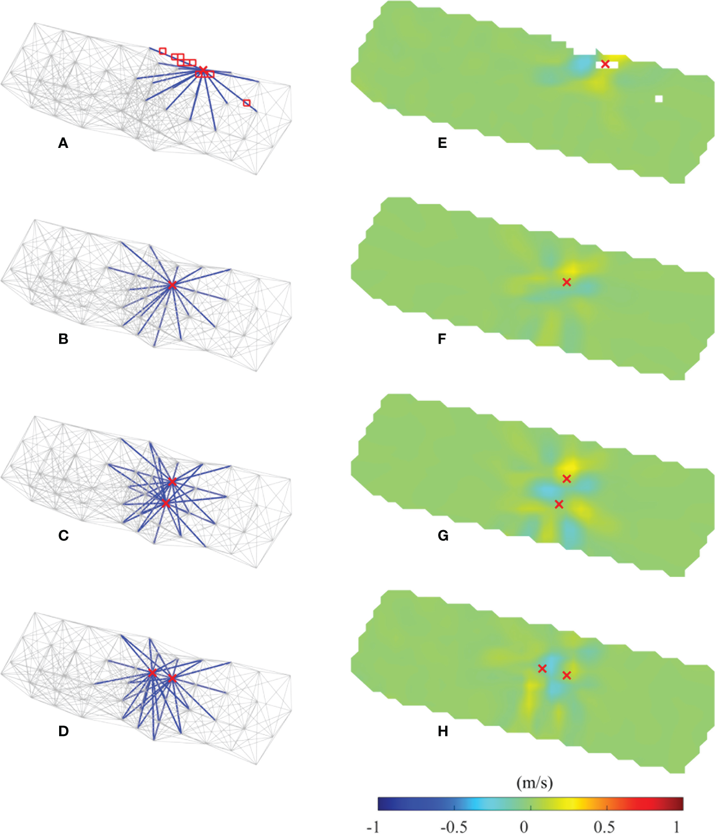 Results of the sensitivity experiments of missing stations in the network at hour 92. (A–D) The cross sign demonstrates the position of the missing station; the blue lines represent the transmission paths related to the missing station. (E–H) Inversion error generated by missing stations. The red cross marks indicate the positions of missing station. The red squares in (A) indicate the missing subdomains induced by the missing station, and the white squares in (E) match the red squares.