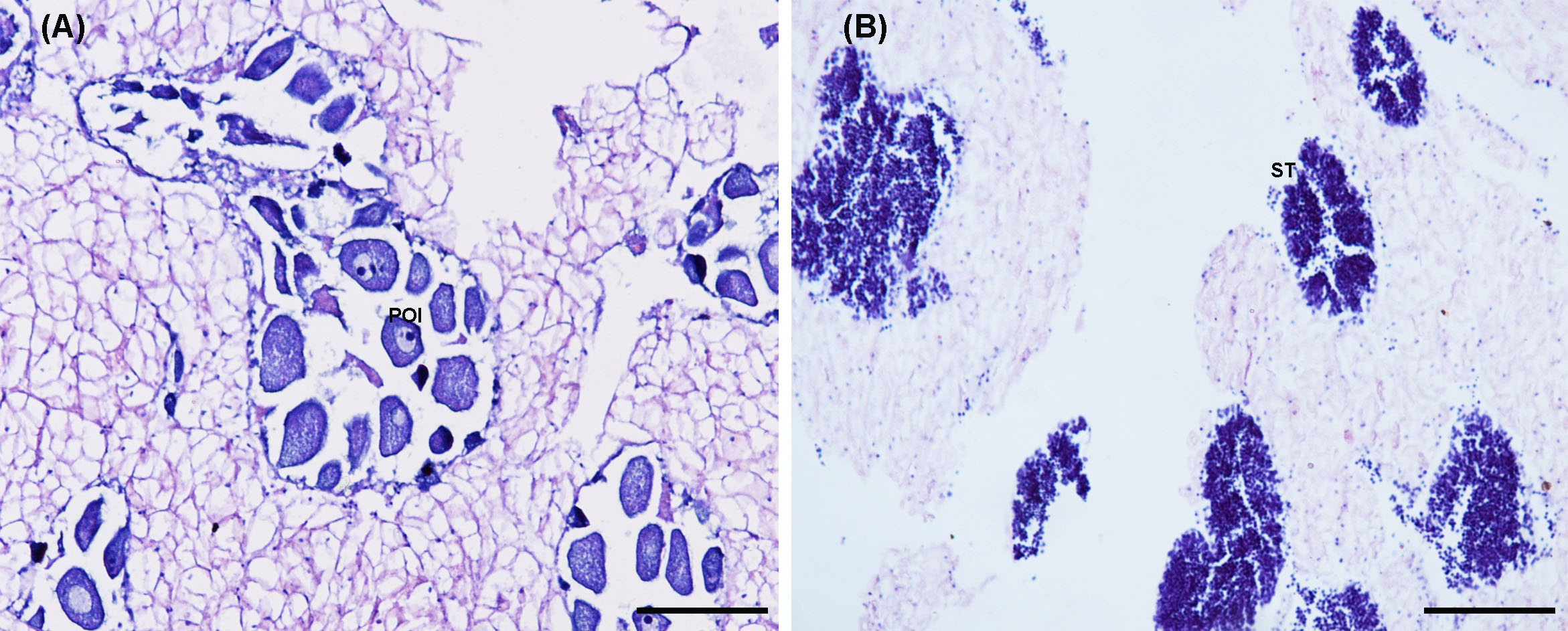 Histological characteristics of the ovary (A) and testis (B) of the C sinensis for transcriptome sequencing. POI, pre-vitellogenesis oocyte; ST: spermatid. Scale bars, 100 μm.