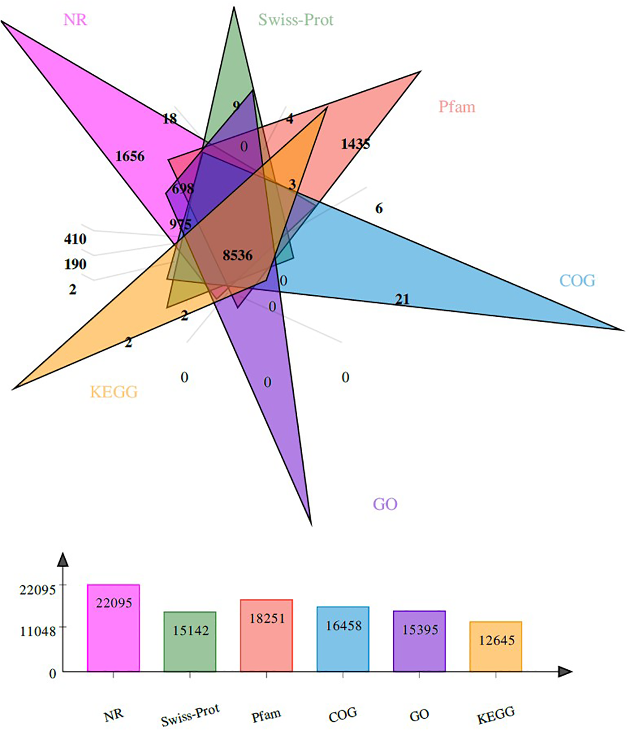The distribution of unigenes in six databases. The colors show different databases. The number represents the total number of unigenes.