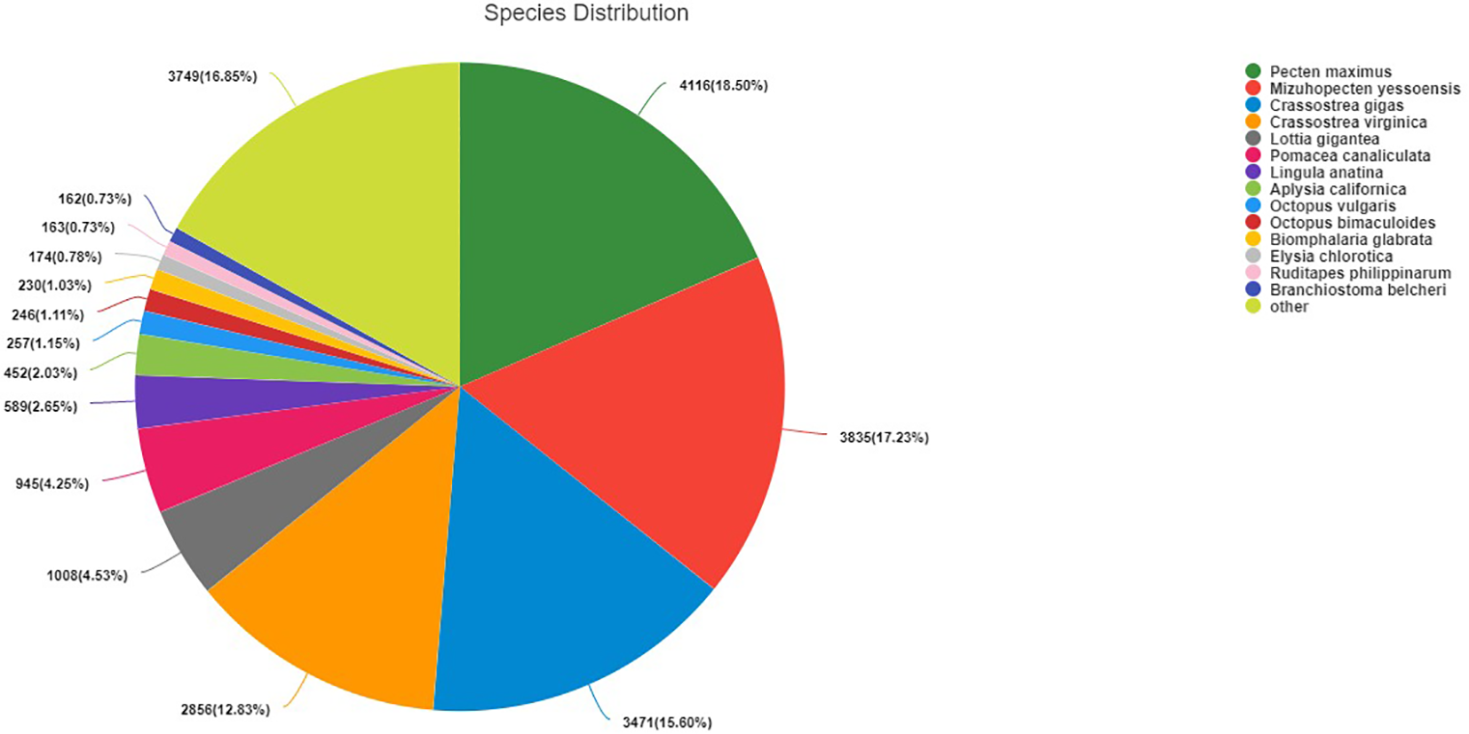 All clean reads were assembled into 134 124 unigenes, and the minimum, longest, and average lengths of unigenes were 201, 29 212 and 1 095 bp, respectively. Among the unigenes, 77 305 unigenes (57.64%) were successfully annotated by searching against the Nr, Swissport, Pfam, COG, GO and KEGG databases. Especially, 22 095 (28.59%) unigenes were annotated to the Nr database, whereas 15 142 (19.59%) unigenes can be fully annotated to the SwissProt database (Figure 2). In addition, the species most represented in BLASTx searches included Pecten maximus (18.5%), Mizuhopecten yessoensis (17.23%) and Crassostrea gigas (4%) (Figure 3).