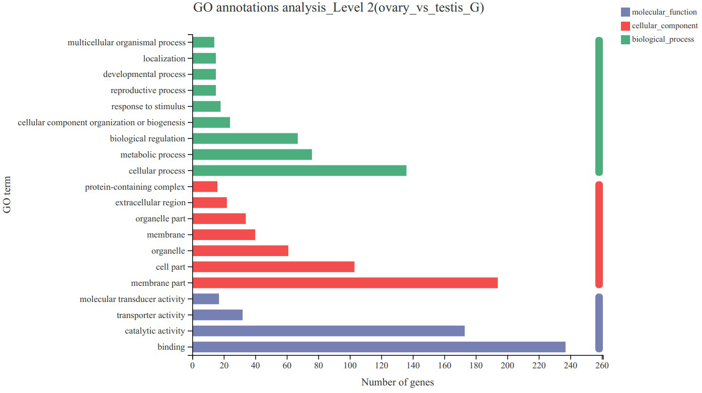 After dissection, the structure of the ovary and testis can be easily distinguished by microscopic observation of gonadal sections. Histological results showed that the ovaries and testes of C. sinensis used for RNA sequencing were at growing stage (stage II) of gonadal maturation (Figure 1).
