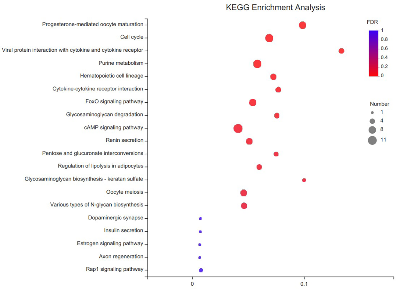 By comparing the databases of ovary and testis, 1 440 DEGs were detected in the transcriptome, of which 1 013 and 427 DEGs were upregulated and downregulated, respectively. To analyze the functions of these DGEs, we conducted GO and KEGG analyses. GO annotation analysis indicated that these DEGs were annotated to three functional ontologies, i.e. molecular function (399 transcripts), cellular component (504 transcripts), and biological process (493 transcripts) (Figure 4). In the biological process category, the metabolic process (GO:0008152) and cellular process (GO:0009987) level 2 terms were the most abundant terms. In the cellular component category, the membrane part (GO:0044425) and cell part (GO:0044464) level 2 terms were the most abundant terms. In the cellular component category, the binding (GO:0005488) and catalytic activity (GO:0003824) level 2 terms were the most abundant terms. KEGG enrichment analysis showed that these DEGs were enriched in 220 specific KEGG metabolic pathways. Several DEGs were mapped to several pathways related with reproduction, such as progesterone-mediated oocyte maturation, cell cycle, cAMP signaling pathway and oocyte meiosis. The top 20 most significantly enriched metabolic pathways are represented in Figure 5.