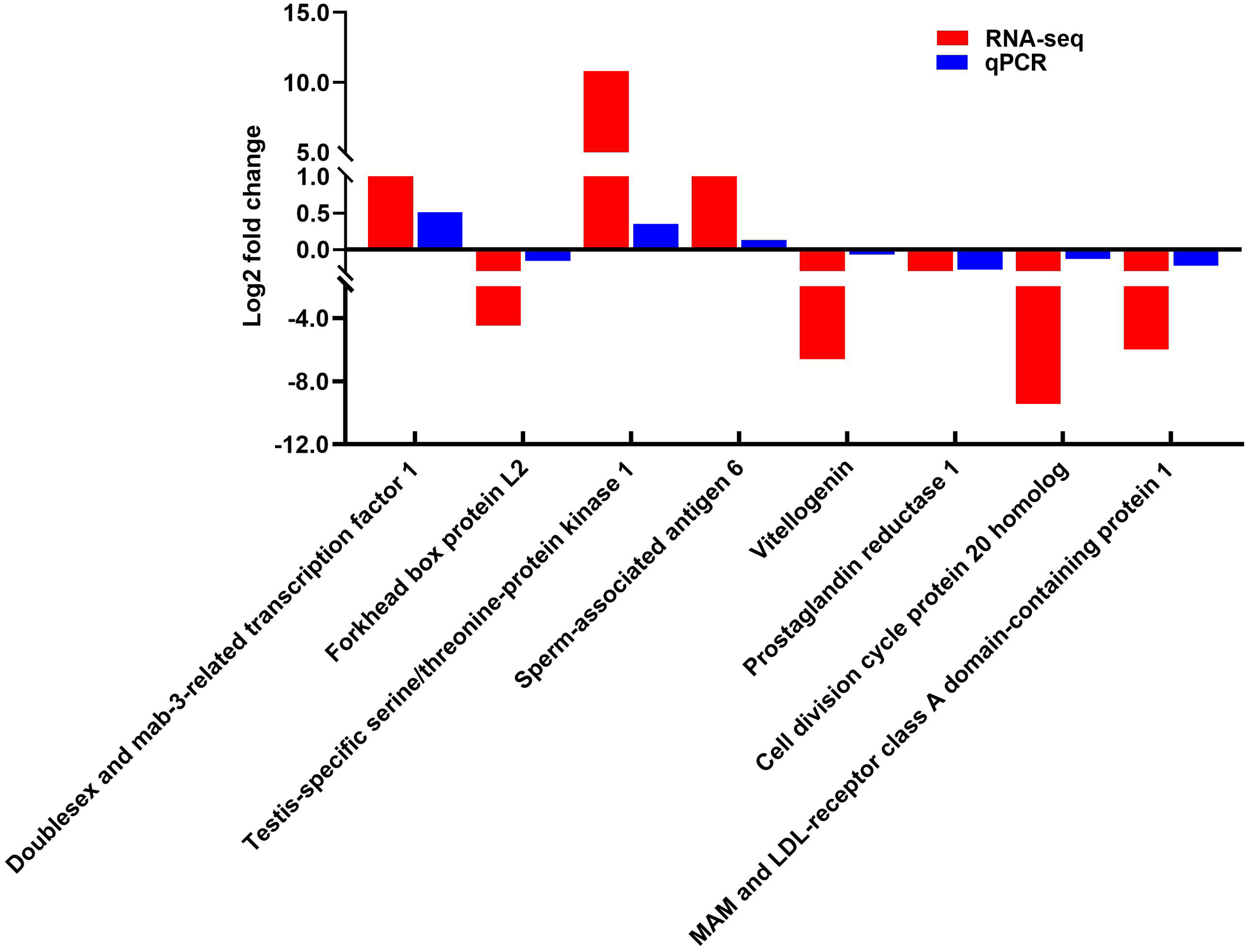 Through the analysis of the overall gene expression profiles of gonads, several candidate genes involved in various processes of sex determination/differentiation and gonadal development were identified (Table 3). Among the candidate genes, twenty-three key genes were mainly involved in sexual determination/differentiation. Specifically, the transcript levels of Foxl2 and GATA-type zinc finger protein 1-like in the ovary were significantly higher than those in the testis. The expression levels of Dmrt1, Sox9, Fem-1, Follistatin, Transformer-2 protein homolog alpha isoform X5, Zinc finger Y-chromosomal protein 1-like, E3 ubiquitin-protein ligase MARCHF3 isoform X1, Synaptonemal complex protein 1 isoform X2, Transcription factor Runt and Protein dpy-30 in the testis were higher than those in the ovary. Twenty key genes were mainly involved in the process of spermatogenesis, and the higher expression levels of Spermatogenesis-associated protein 17-like isoform X1, Meiotic recombination protein SPO11-like isoform X1, Meiotic recombination protein REC8 homolog isoform X2, Ropporin-1-like protein, Sperm-tail PG-rich repeat-containing protein 2-like (STPG1), Testis-specific serine/threonine-protein kinase 1, Testis-specific serine/threonine-protein kinase 3-like, Sperm-associated antigen 6, Kelch-like protein 10, Armadillo repeat-containing protein 4-like isoform X1 and G2/mitotic-specific cyclin-B3-like were found in the testis. Moreover, fifteen genes related to ovarian development and five genes encoding steroid biosynthesis/metabolism were identified in the ovary and testis.