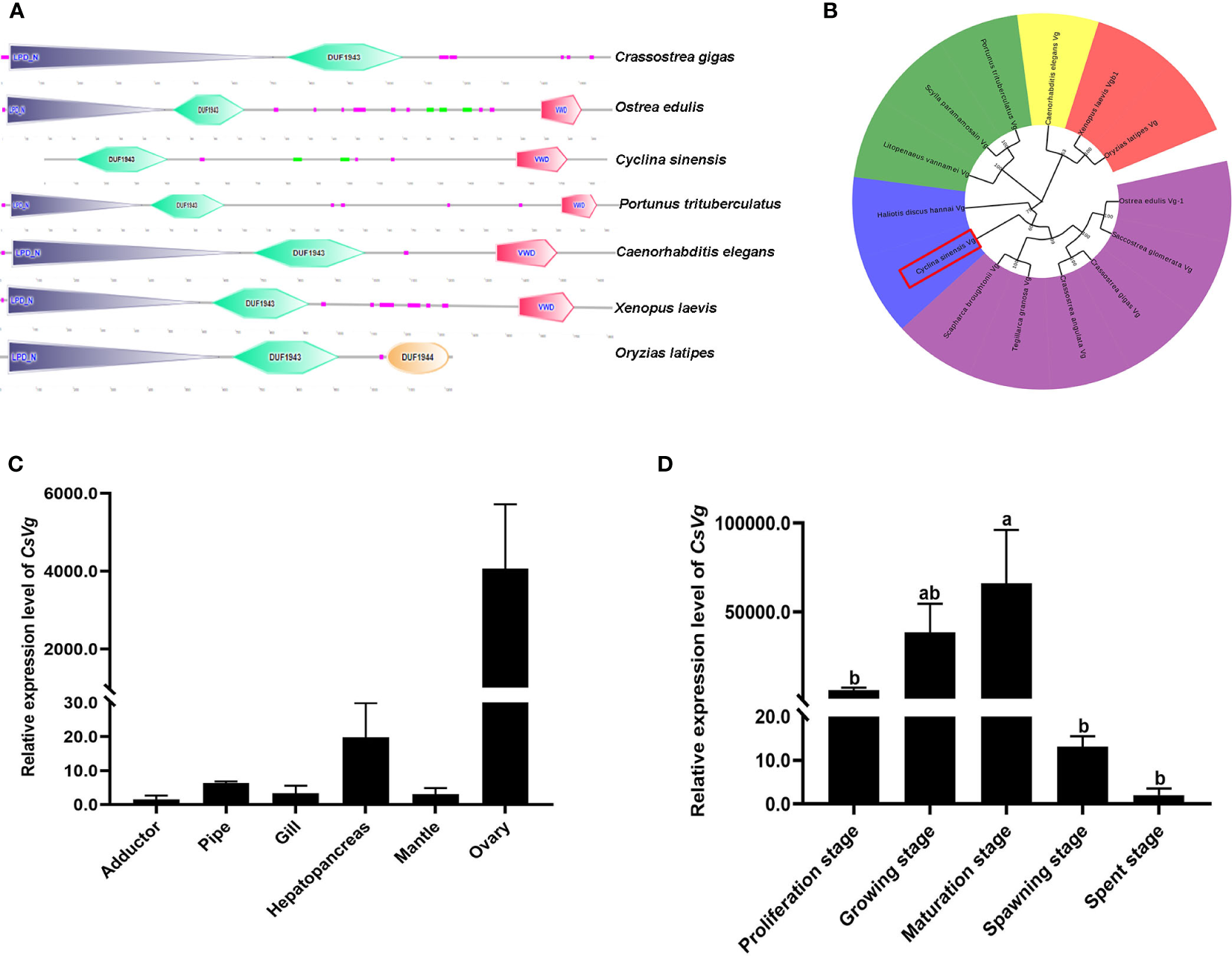 Based on the results of transcriptome sequencing, the higher expression level of CsVg was found in the ovary of C. sinensis, the CsVg was selected for the further analysis in this study. The amino acid sequence and open reading frame (ORF) of CsVg were predicted by the ORF finder program (http://www.ncbi.nlm.nih.gov/gorf/gorf.html). The conserved domains of CsVg and other species were analyzed using the online software Simple Modular Architecture Research Tool (http://smart.embl-heidelberg.de/smart/set_mode.cgi?NORMAL=1). Subsequently, ClustalX and MEGA 5.0 software were used to carry out multiple sequence alignment and phylogenetic tree construction of neighbor-joining (NJ) system. The amino acid sequences of other species used in these analyses were obtained from GenBank, including Xenopus laevis (AB092605.1), Oryzias latipes (AB092605.1), Caenorhabditis elegans (X56213.1), Portunus trituberculatus (DQ000638.1), Scylla paramamosain (KU987908.1), Litopenaeus vannamei (AY321153.2), Haliotis discus hannai (AB360714.1), Scapharca broughtonii (MG580782.1), Tegillarca granosa (JQ266265.2), Crassostrea angulate (JX218047.2), Crassostrea gigas (AB084783.1), Saccostrea glomerata (KU194475.1) and Ostrea edulis (XM_048903027.1).