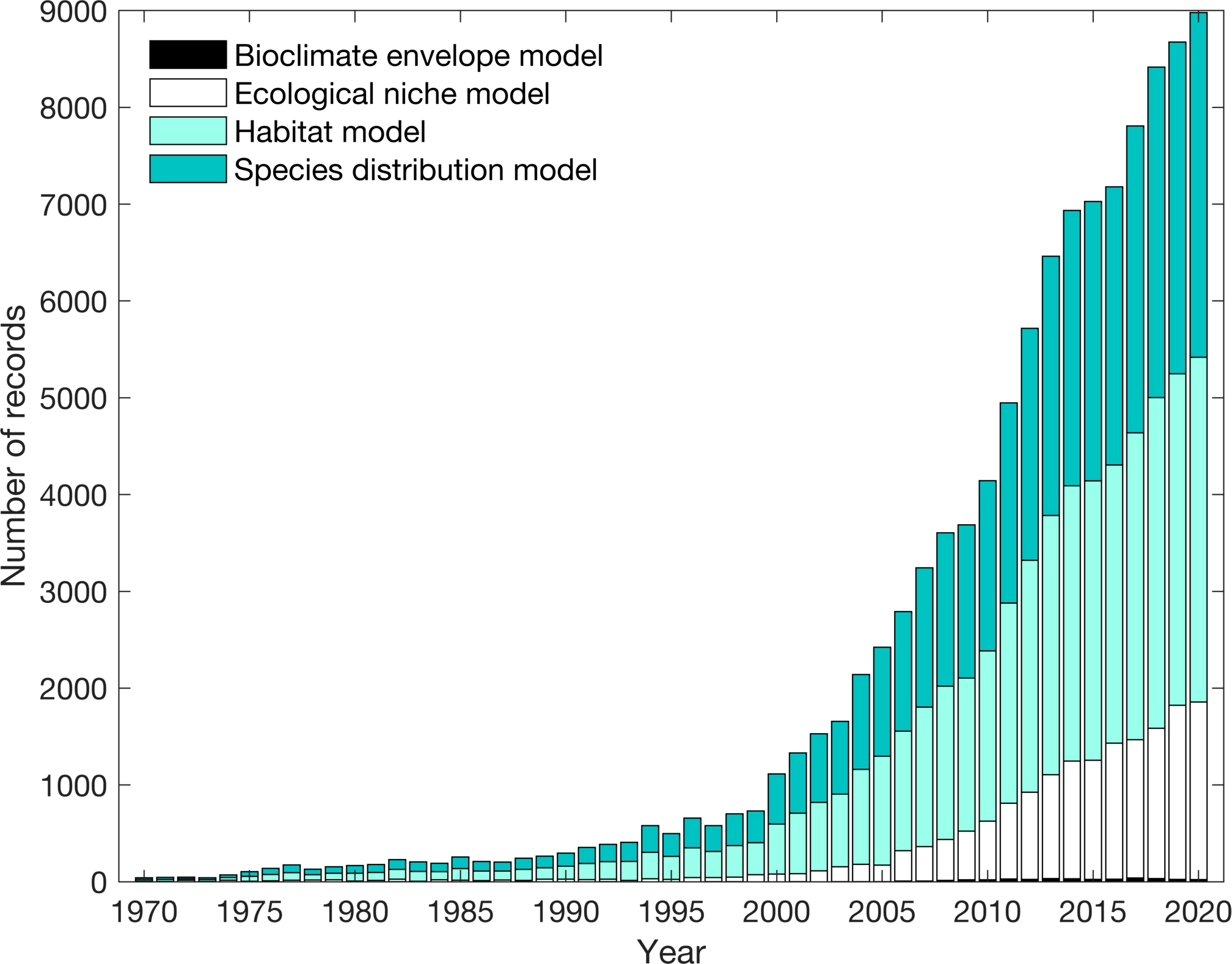 Web of Science search examining the cumulative number of records in the scientific literature on species distribution models, habitat models, ecological niche models, and bioclimate envelope models between 1970-2020. Five Web of Science searches were performed: (1) species AND distribution AND model*; (2) habitat AND model*; (3) ecolog* AND niche AND model*; (4) environment* AND niche AND model*, and; (5) bioclimate AND envelope AND model*. Results from the third and fourth search were combined in this figure.