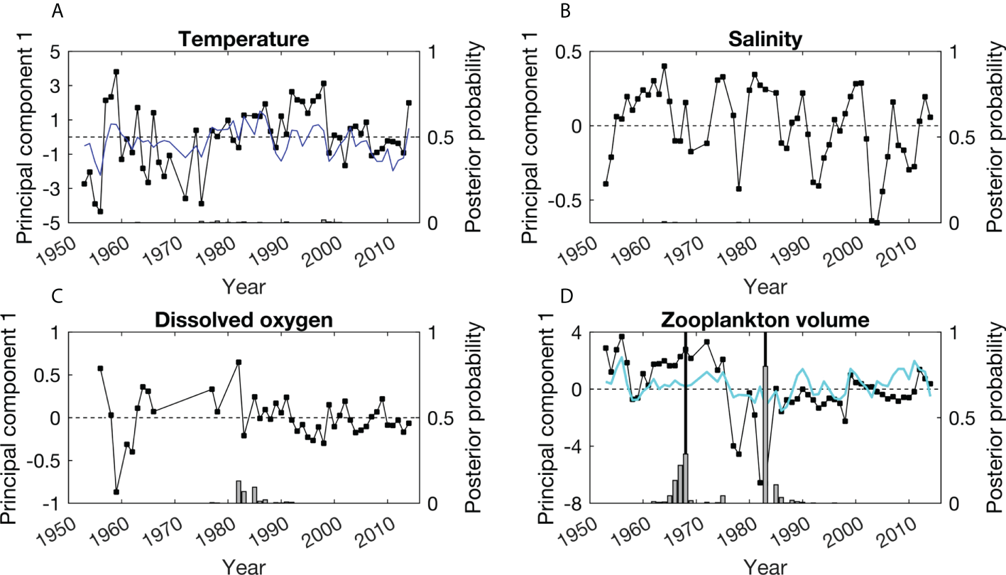 Time series of the first principal component of (A) temperature, (B) salinity, (C) dissolved oxygen (DO) concentration, and (D) mesozooplankton displacement volume from the southern California Current System. Note that there are some gaps in DO measurements during the early years of the CalCOFI time series. Horizontal, dashed lines indicate principal component scores of zero, while thick, vertical lines represent the timing of break points identified in time series. Gray bars show the posterior probability of a change point occurring each year in the time series of each oceanic variable. The winter Pacific Decadal Oscillation (PDO) is included as a blue line in (A) and its inverse is included as a turquoise line in (D) to illustrate correlations among principal components and this regional climate index.
