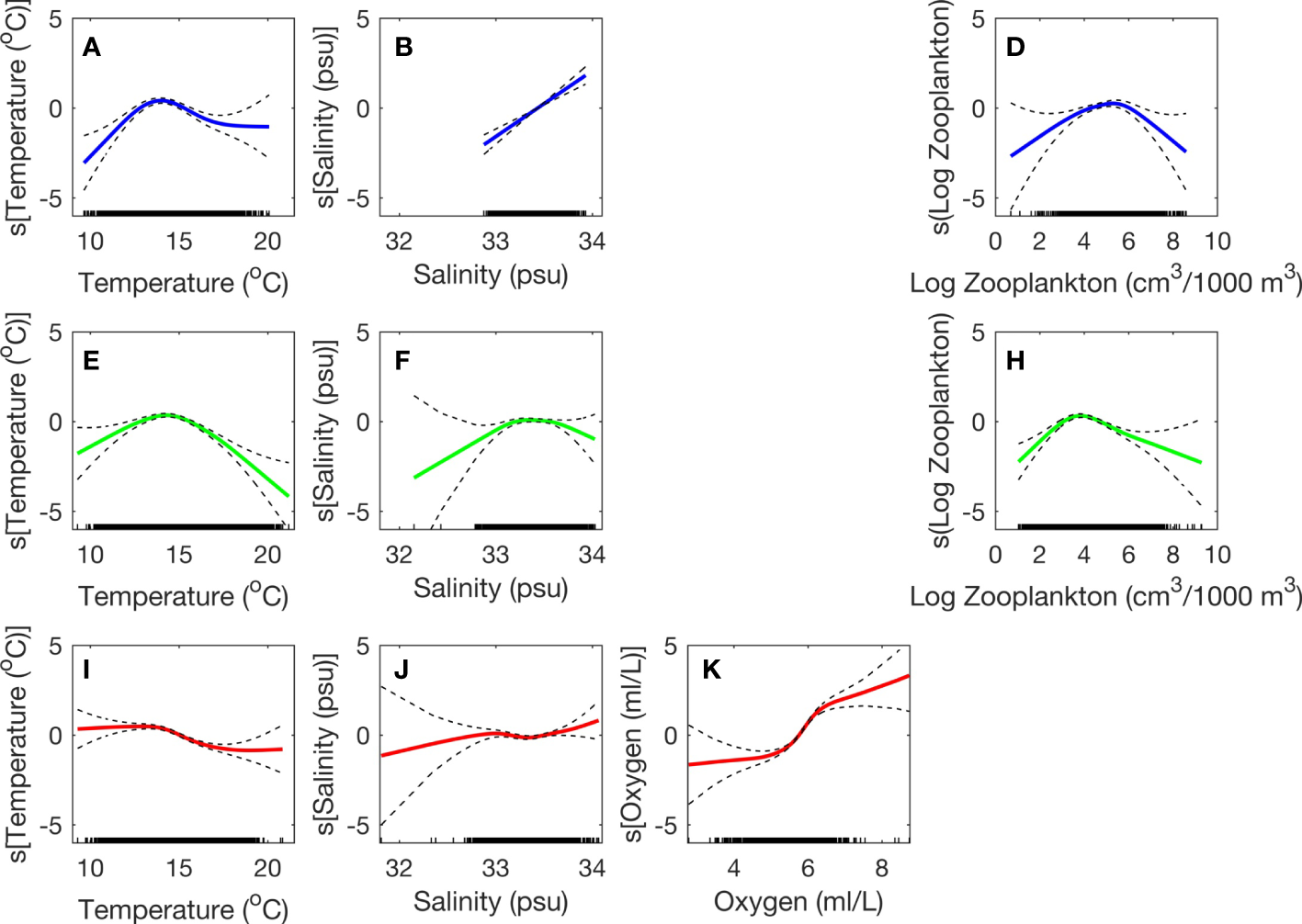 Generalized additive model (GAM) response curves for S. sagax during three different spawning stock biomass (SSB) change points: 1951-1963 (A-D; blue), 1964-1997 (E-H; green), and 1998-2015 (I-K; red). Dashed lines indicate that 95% confidence intervals for each response curve. Missing subplots (log zooplankton during 1998-2015 and oxygen in 1951-1963 and 1964-1997) are indicative that a particular oceanic variable was not included in the most parsimonious GAM. Rug plots are displayed at the bottom of each subplot.