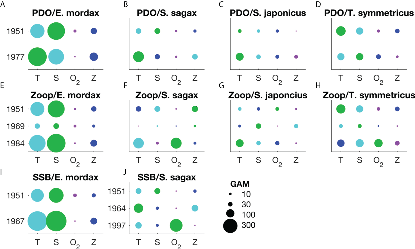 Rank order comparison between the influence of each oceanic variable on the presence/absence of larvae of E. mordax, S. sagax, S. japonicus, and T. symmetricus. Results are shown for change points designated based on changes in the sign of the Pacific Decadal Oscillation (PDO; A-D); break points in the mesozooplankton volume time series (E-H; the abbreviation “zoop” is used when labeling the title of these subplots), and; break points in the time series of E. mordax and S. sagax spawning stock biomass (SSB; I, J). Unless otherwise specified, time periods for each type of change point are the same across all species. Only the start year of a particular regime is listed here. Oceanic variables are abbreviated as follows: T – temperature, S – salinity, O2 – dissolved oxygen concentration, Z – mesozooplankton volume. Comparisons between variables are based on the change in deviance (ΔD) when one variable is removed relative to the deviance of the full model. The scale for ΔD is shown in the lower, right corner of the figure. Note that ΔD is influenced by sample size so this metric is comparable across from a single regime, but not across multiple regime types due to variations in sample size. The rank order of different environmental variables for each period is shown based on circle size and color: green – 1st rank, turquoise – 2nd rank, blue – 3rd rank, purple – 4th rank.