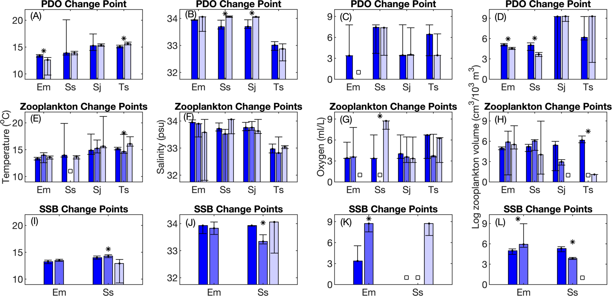 Changes between periods in the response curve range from generalized additive models (GAMs). Response curve range is defined as the difference between the maximum and minimum value in a GAM response curve and is indicative of how strongly an environmental variable influences larval fish occurrence. Median values and 95% confidence intervals from bootstrap analysis are shown. Results are shown for change points designated based on changes in the sign of the Pacific Decadal Oscillation (PDO; A-D); break points in the mesozooplankton volume time series (E-H), and; break points in the time series of E. mordax and S. sagax spawning stock biomass ( SSB; I-L). GAM results for different periods are displayed in groups, with the first period represented by the left most bar in a group (dark blue color) and the last period displayed to the right (light lavendar color). Intermediate periods are displayed in the middle of each group. Stars (*) indicate that periods are significantly different from each other for a given species and environmental variable based on non-overlapping 95% confidence intervals. White squares indicate that a particular variable was not included in the best fit GAM model(s). Numbers shown in some subplots indicate the maximum response curve range in a few cases where the maximum value exceeds the y-axis limit of a graph. Species names are abbreviated based on the first letter of the genus and the first letters of the species name: Em, Engraulis mordax; Ss, Sardinops sagax; Sj, Scomber japonicus; Ts, Trachurus symmetricus.