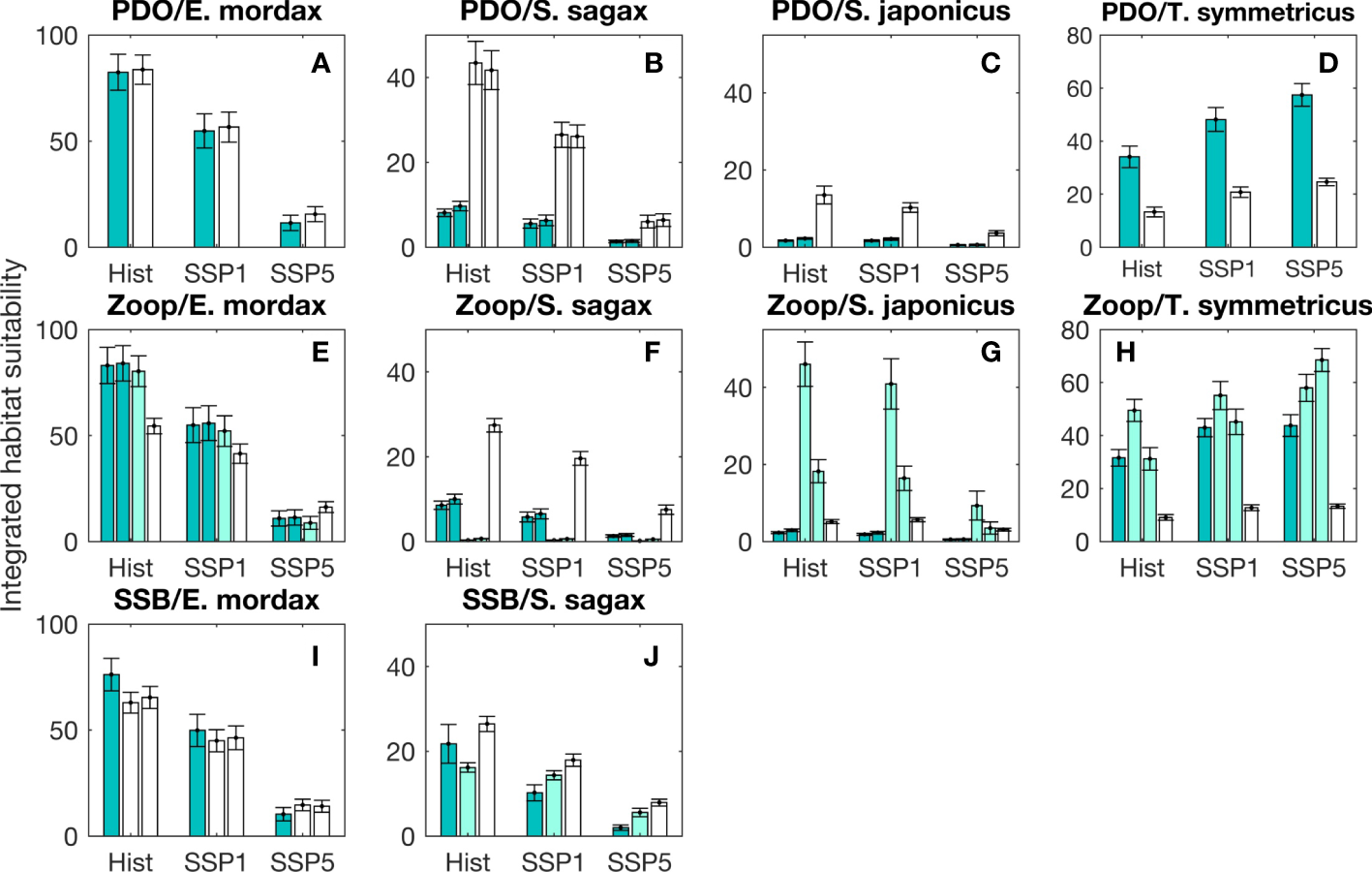 Changes between periods in the peak value of generalized additive model (GAM) response curves. The peak in response curves is indicative of the environmental conditions that maximize the likelihood of occurrence of E. mordax, S. sagax, S. japonicus, and T. symmetricus. Median values and 95% confidence intervals from bootstrap analysis are shown. Results are shown for change points designated based on changes in the sign of the Pacific Decadal Oscillation (PDO; A-D); break points in the mesozooplankton volume time series (E-H), and; break points in the time series of E. mordax and S. sagax spawning stock biomass (SSB; I-L). Bar colors, symbols, and species name abbreviations are the same as in Figure 6.