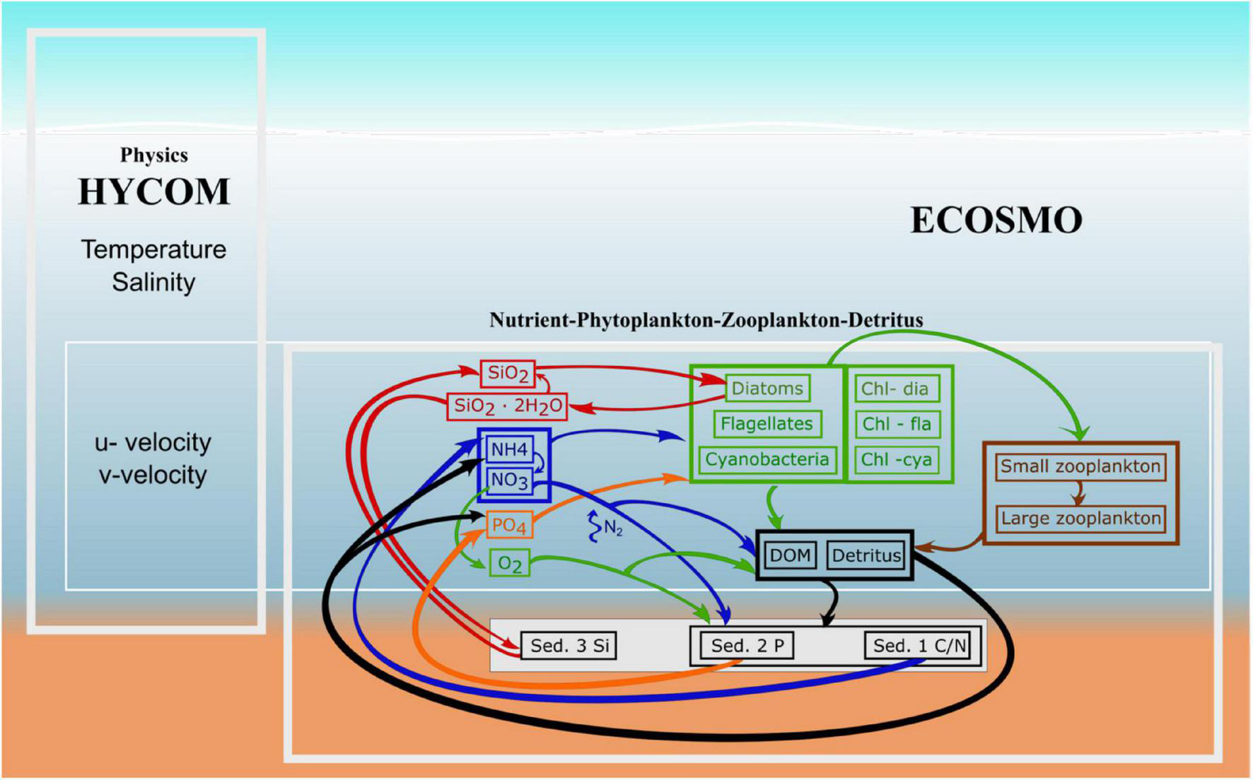 ECOSMO is coupled online, such that the transport (mixing and advection) of the biogeochemical model compartments is done as a part of the HYCOM tracer-transport routines and the time stepping of the two models is aligned. The physical fields influence the results of the biogeochemical model through currents, temperature, and salinity, but there is no feedback from the ECOSMO to HYCOM.