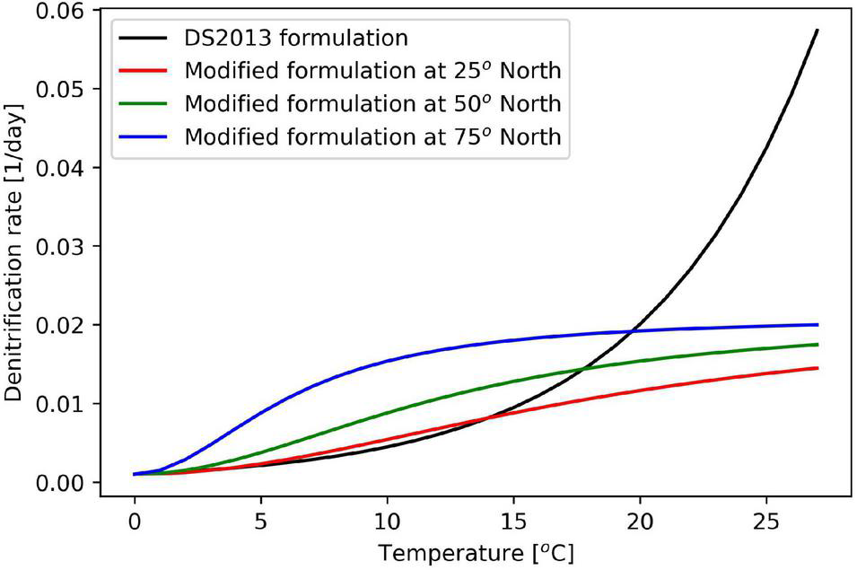 The physical model typically has a large influence on the results of biogeochemical models (Skogen and Moll, 2005) and these models often require retuning to produce comparable results after being coupled to a new physical model when used in a different model setup or, more importantly, run for a different region. Therefore, some parameters needed adjustment as part of a tuning that occurred after coupling ECOSMO to HYCOM and changing the modeled region from the North Sea and Baltic Sea to open ocean North Atlantic (Table 2). Some additional changes were implemented in the model after evaluating the result in the lower layers and the sediments. The denitrification rate for sediments was modeled with an exponential temperature dependence in DS2013, where the function worked well because the original model only covered the North Sea and Baltic Sea with only moderate temperature variations among the regions. However, when the model encompasses both the equator and the Arctic, the modeled difference in denitrification rates between the coldest and the warmest region is up to two orders of magnitude (Figure 2). To reduce the difference in denitrification between warm and cold regions, the denitrification rate is now also a function of latitude and temperature, such that the temperature at which this process works at medium efficiency decreases with latitude, while the direct temperature dependency is weaker than in the original model formulation.