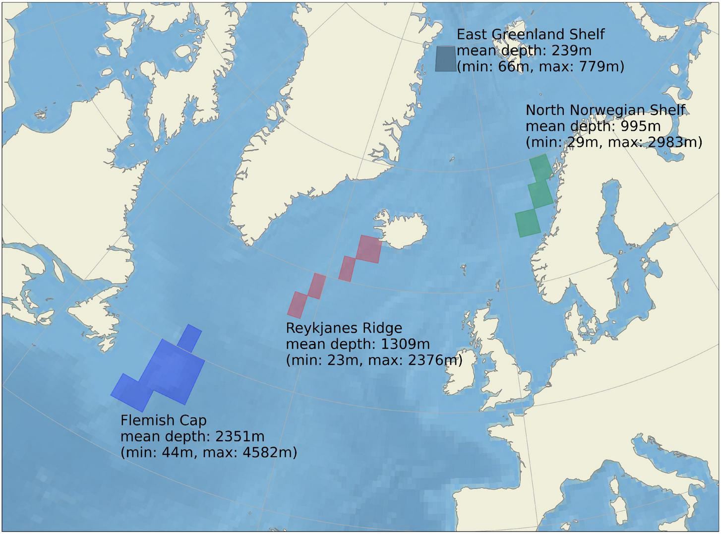 | Flemish Cap | Reykjanes Ridge | North Norwegian Shelf | East Greenland Shelf | |