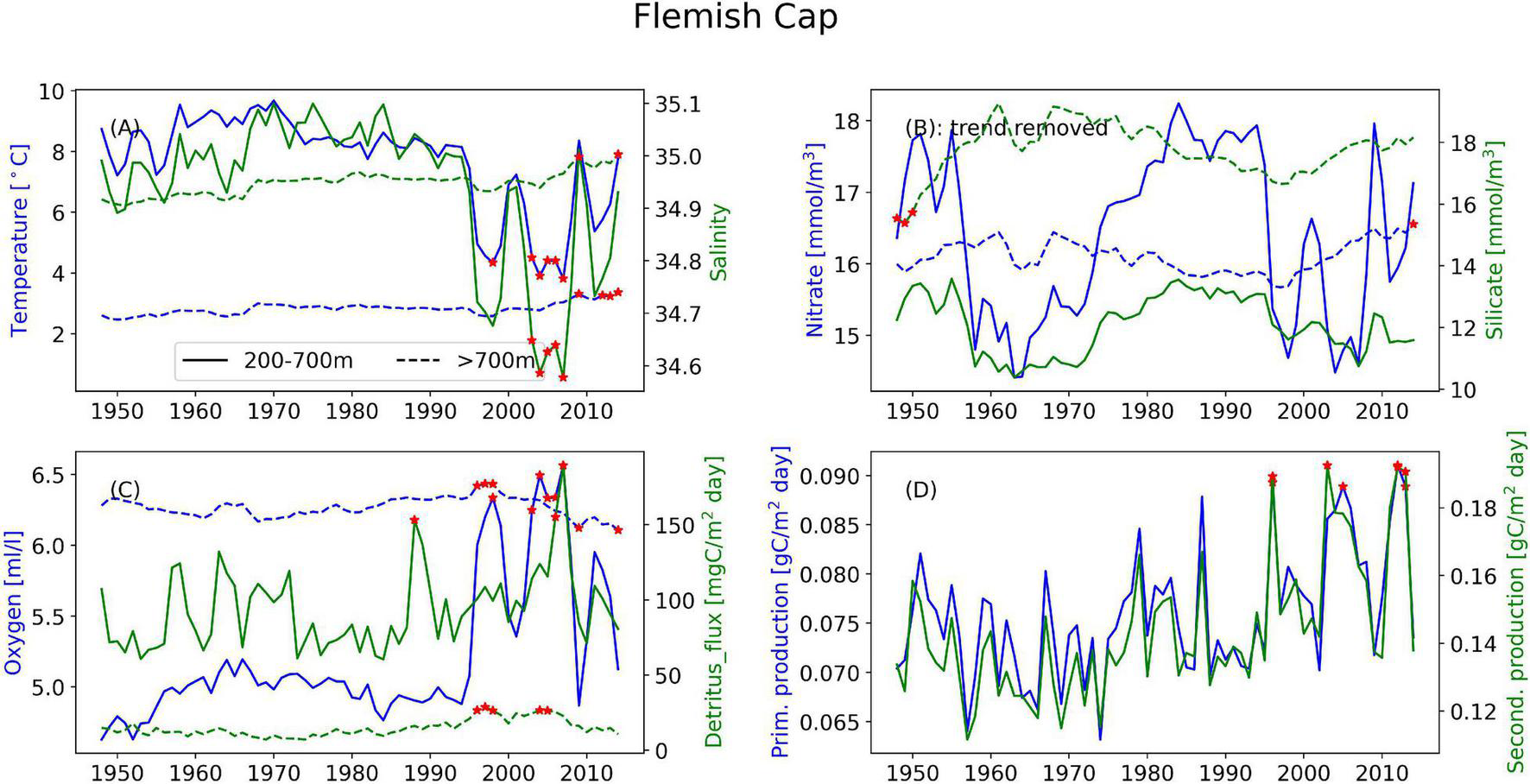 Timeseries of the annual mean of different variables illustrating the interannual variability at the Flemish Cap for (A) temperature (blue) and salinity (green), (B) nitrate (blue) and silicate (green), and (C) oxygen (blue) and detritus (green). Solid lines are areas with bottom depth between 200 and 700 m, dashed lines are areas deeper than 700 m. (D) Depth-integrated primary production (blue) and secondary production (green) from the full area. Red stars indicate years when values are outside two standard deviations of the temporal mean.