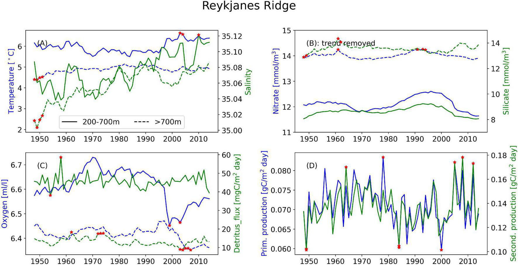 Timeseries of the annual mean of different variables illustrating the interannual variability at the Reykjanes Ridge for (A) temperature (blue) and salinity (green), (B) nitrate (blue) and silicate (green), and (C) oxygen (blue) and detritus (green). Solid lines are areas with bottom depth between 200 and 700 m, dashed lines are areas deeper than 700 m. (D) Depth-integrated primary production (blue) and secondary production (green) from the full area. Red stars indicate years when values are outside two standard deviations of the temporal mean.