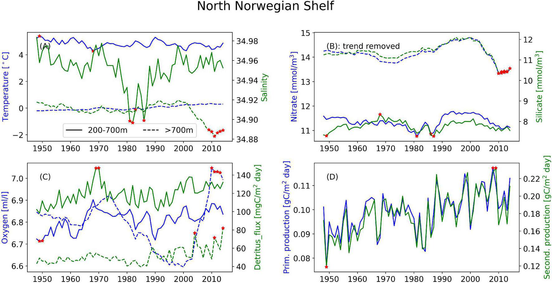 Timeseries of the annual mean of different variables illustrating the interannual variability at the North Norwegian Shelf for (A) temperature (blue) and salinity (green), (B) nitrate (blue) and silicate (green), and (C) oxygen (blue) and detritus (green). Solid lines are areas with bottom depth between 200 and 700 m, dashed lines are areas deeper than 700 m. (D) Depth-integrated primary production (blue) and secondary production (green) from the full area. Red stars indicate years when values are outside two standard deviations of the temporal mean.