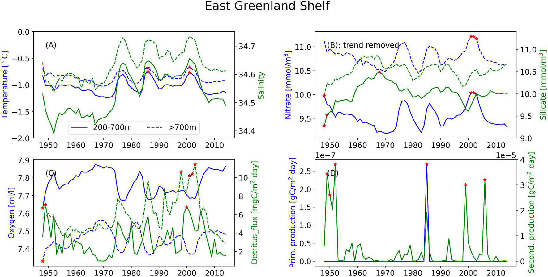 Timeseries of the annual mean of different variables illustrating the interannual variability at the East Greenland Shelf for (A) temperature (blue) and salinity (green), (B) nitrate (blue) and silicate (green), and (C) oxygen (blue) and detritus (green). Solid lines are areas with bottom depth between 200 and 700 m, dashed lines are areas deeper than 700 m. (D) Depth-integrated primary production (blue) and secondary production (green) from the full area. Red stars indicate years when values are outside two standard deviations of the temporal mean.