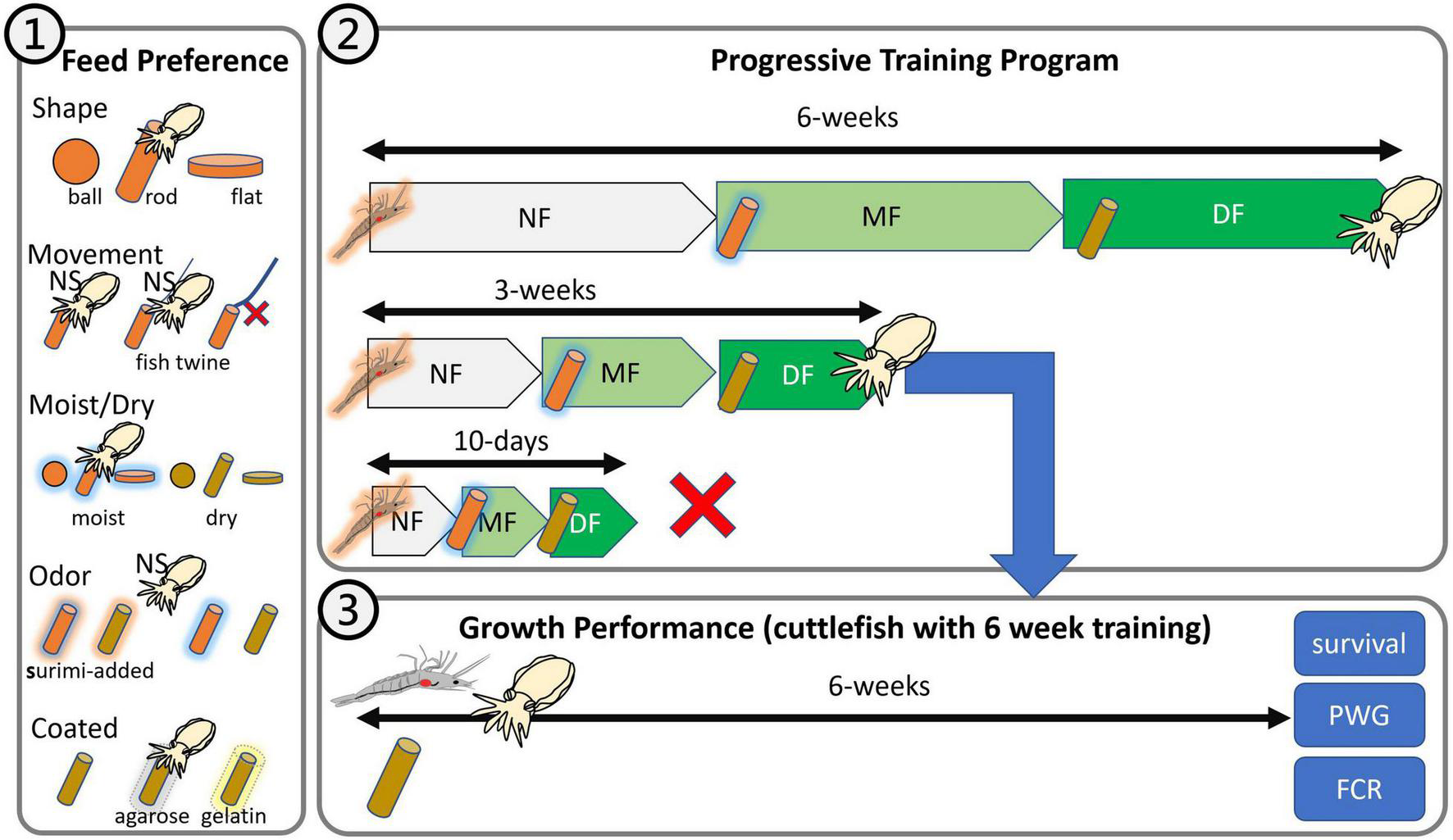 Figure 1. Experimental design of this study. (1) Feed preference test: shape, movement, moistness, odor, and coating; (2) progressive training program: 10-day, 3-week, and 6-week programs; (3) growth performance: feeding of fresh shrimp and dry feed.