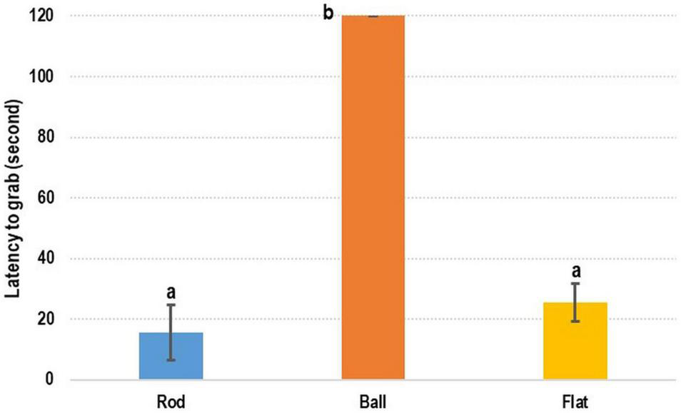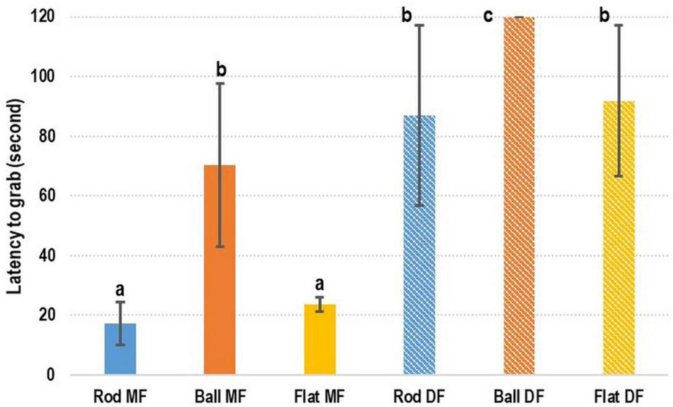 In terms of the preference of cuttlefish for DF or MF, the rod- and flat rod-shaped MF exhibited the shortest latency-to-grab times of 17.38 ± 7.16 s and 23.64 ± 2.34 s, respectively (Figure 3). The latency-to-grab times for the ball-shaped MF (70.24 ± 27.38 s), rod-shaped DF (87.08 ± 30.28 s), and flat rod-shaped DF (91.96 ± 25.31) were similar. No cuttlefish grabbed the ball-shaped DF (120 s). Relative to the various types of MF, the latency-to-grab times of the various types of DF were significantly longer (p < 0.05).