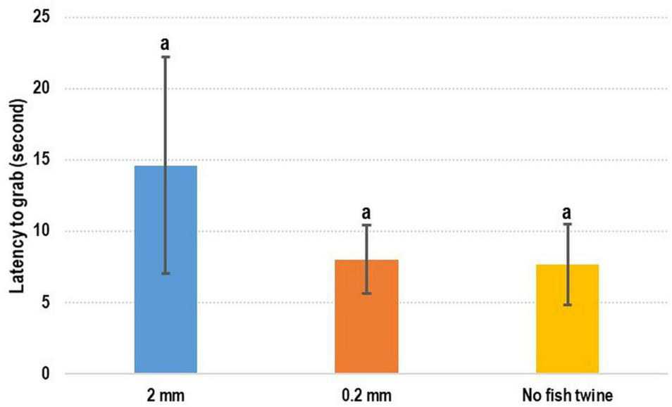 No statistical difference was observed in the movement experiments (Figure 3). The latency-to-grab times were 14.60 ± 7.61 s, 8.02 ± 2.38 s, and 7.66 ± 2.84 s for the experiments in which a 2-mm fishing line was used, a 0.2-mm fishing line was used, and no fishing line was used, respectively. The time required when a 2-mm fishing line was used was longer than that required when a 0.2-mm fishing line or no fishing line was used.