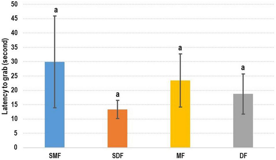 The addition of shrimp surimi did not enhance the attractiveness of the artificial feed to cuttlefish (Figure 4). No significant difference was observed between the treatments. The latency-to-grab time was slightly shorter for dry SF than for the other types of feed; however, the longest latency-to-grab time was recorded for moist SF. Specifically, the latency-to-grab times of SMF, SDF, MF, and DF were 29.92 ± 16.02 s, 13.28 ± 3.18 s, 23.46 ± 9.30 s, and 18.72 ± 7.00 s, respectively.