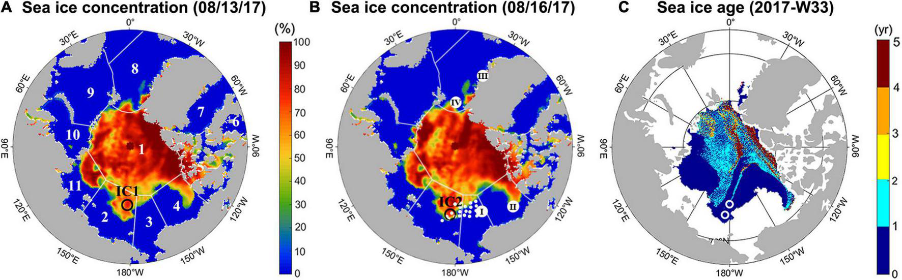 Sea ice concentration of the Arctic Ocean on (A) 13 August 2017, and (B) 16 August 2017. Color shading indicates the percentage of sea ice obtained from the National Snow and Ice Data Center (NSIDC; Maslanik and Stroeve, 1999). (A) Location of the first ice camp (IC1; open circle) and the Sea Ice Index regions of the Arctic Ocean (numbers), corresponding to (1) Central Arctic, (2) East Siberian Sea, (3) Chukchi Sea, (4) Beaufort Sea, (5) Canadian Archipelago, (6) Hudson, (7) Baffin, (8) Greenland Sea, (9) Barents Sea, (10) Kara Sea, and (11) Laptev Sea. Data for the Sea Ice Index regions were taken from Meier et al. (2007). (B) Location of the second ice camp (IC2; open circle) and seawater sampling stations (closed circle). Roman numerals represent the locations of previous studies investigating the impact of sea ice melting on air-sea exchange of CO2: (I) Cai et al. (2010), (II) Else et al. (2013), (III) Rysgaard et al. (2013), and (IV) Rysgaard et al. (2012). (C) Sea ice age in the 33rd week (08/14 to 08/20) of 2017, obtained from the NSIDC (Tschudi et al., 2019). The locations of the two ice camps are also shown (white circles).