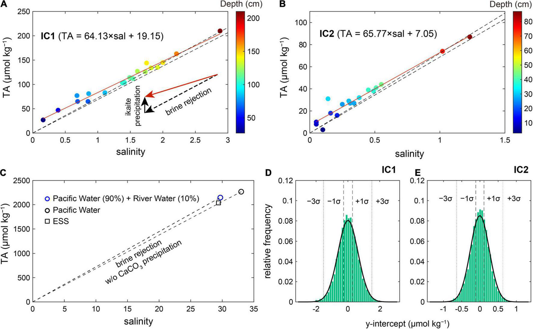 Relationships between TAICE and SICE at IC1 (A) and IC2 (B). Red lines indicate the linear regression lines. Positive intercepts suggest the existence of CaCO3 crystals in sea ice samples. Color shading represents the depths for the sea ice segments. (C) Linear relationships representing conservative mixing between pure sea ice water (S = 0 and TA = 0 μmol kg– 1) and two seawater endmember values (open circles), with one representing Pacific Winter Water and the other representing the same seawater but diluted by 10% with river water with TA = 1048 μmol kg– 1. These lines are also shown in (A,B). Note that SICE and TAICE in the winter season are likely to be located in the triangle (close to the bottom line) because river discharge in winter (67 km3 month– 1) is ∼25% of summer (253 km3 month– 1) in the Arctic Ocean (Holmes et al., 2012). In the winter, net community production, which can deviate the linear relationship between salinity and TA by raising TA, is limited by reduced solar radiation. The square symbol represents the mean seawater TA and S values in the East Siberian Sea (ESS). Probability distribution plots showing intercept values that could be produced from excess TA in river water with no CaCO3 precipitation at IC1 (D) and IC2 (E). An anomalously high TAICE value (=219 μmol kg– 1; Figure 2A) was excluded in this figure and calculating the linear regression. It is a note that including it increased the y-intercept (i.e., TAEX).
