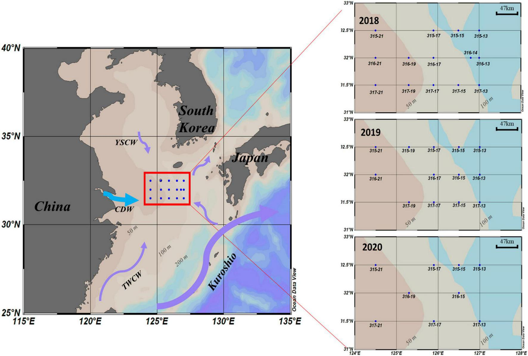 Sampling stations in the Northern East China Sea (NECS), 2018∼2020.