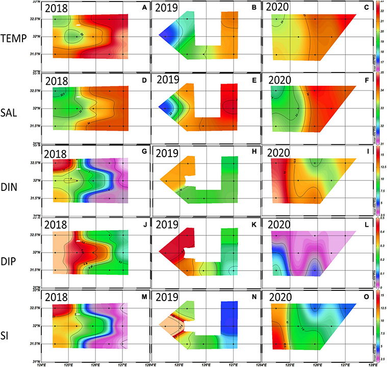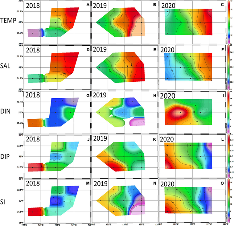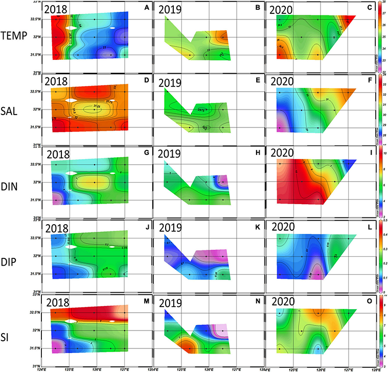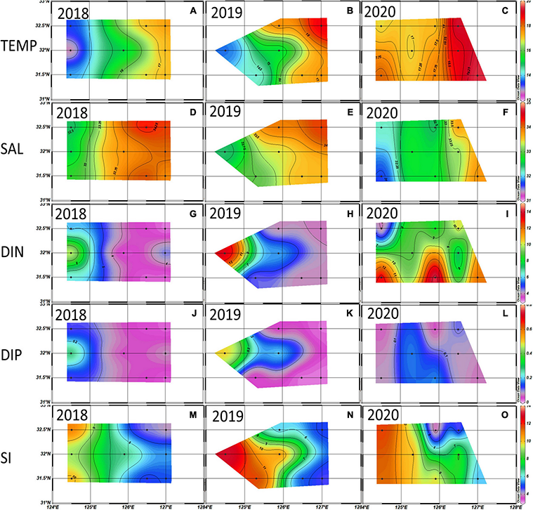The horizontal distributions of temperature, salinity and nutrients in the euphotic zone from winters in 2018–2020 are shown in Figure 2. In the 2018–2020 winters, the water temperature and salinity decreased from the eastern part toward the western part in the NECS, but all of the nutrients (DIN, DIP, and SiO2) showed a reverse trend. Low salinity (< 33 ‰) and high DIN (> 12 μM) waters appeared in the southwestern part of our study area in 2020, and they spread eastward to 126°E. DIP and SiO2 had no significant interannual differences in their horizontal distribution.