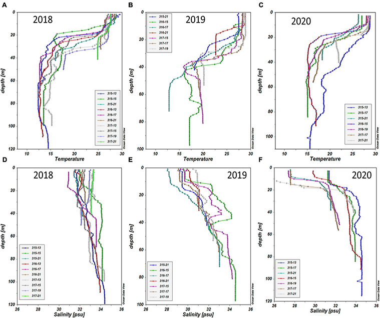 Vertical profiles of temperature and salinity in the Northern East China Sea (NECS), 2018∼2020 summer. (A) 2018, (B) 2019, (C) 2020 for temperature, (D) 2018, (E) 2019, and (F) 2020 for salinity.