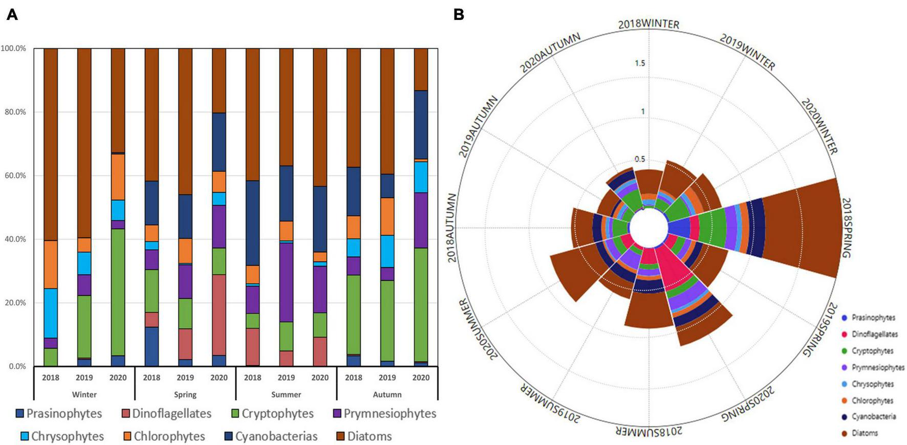 Seasonal contributions of phytoplankton communities (A) and phytoplankton communities and chlorophyll-a concentrations (μg/L) (B) averaged from all the stations for each cruise period in the Northern East China Sea (NECS), 2018∼2020.
