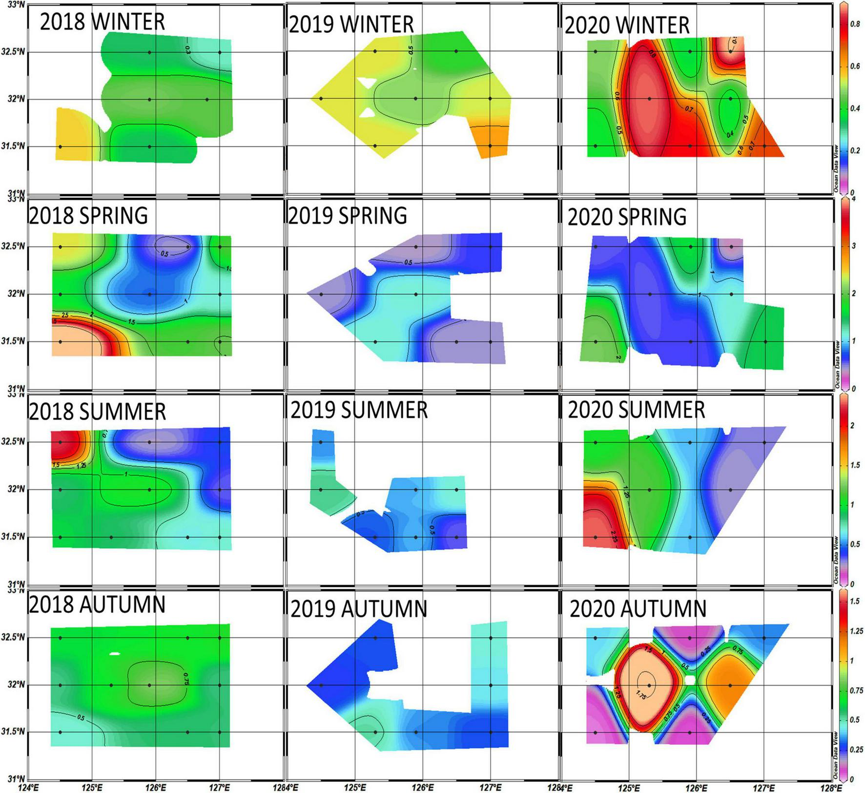 Horizontal distributions of chlorophyll-a concentrations (μg/L) averaged from the euphotic depth (100%, 30%, and 1%) in the Northern East China Sea (NECS), 2018∼2020 all seasons.