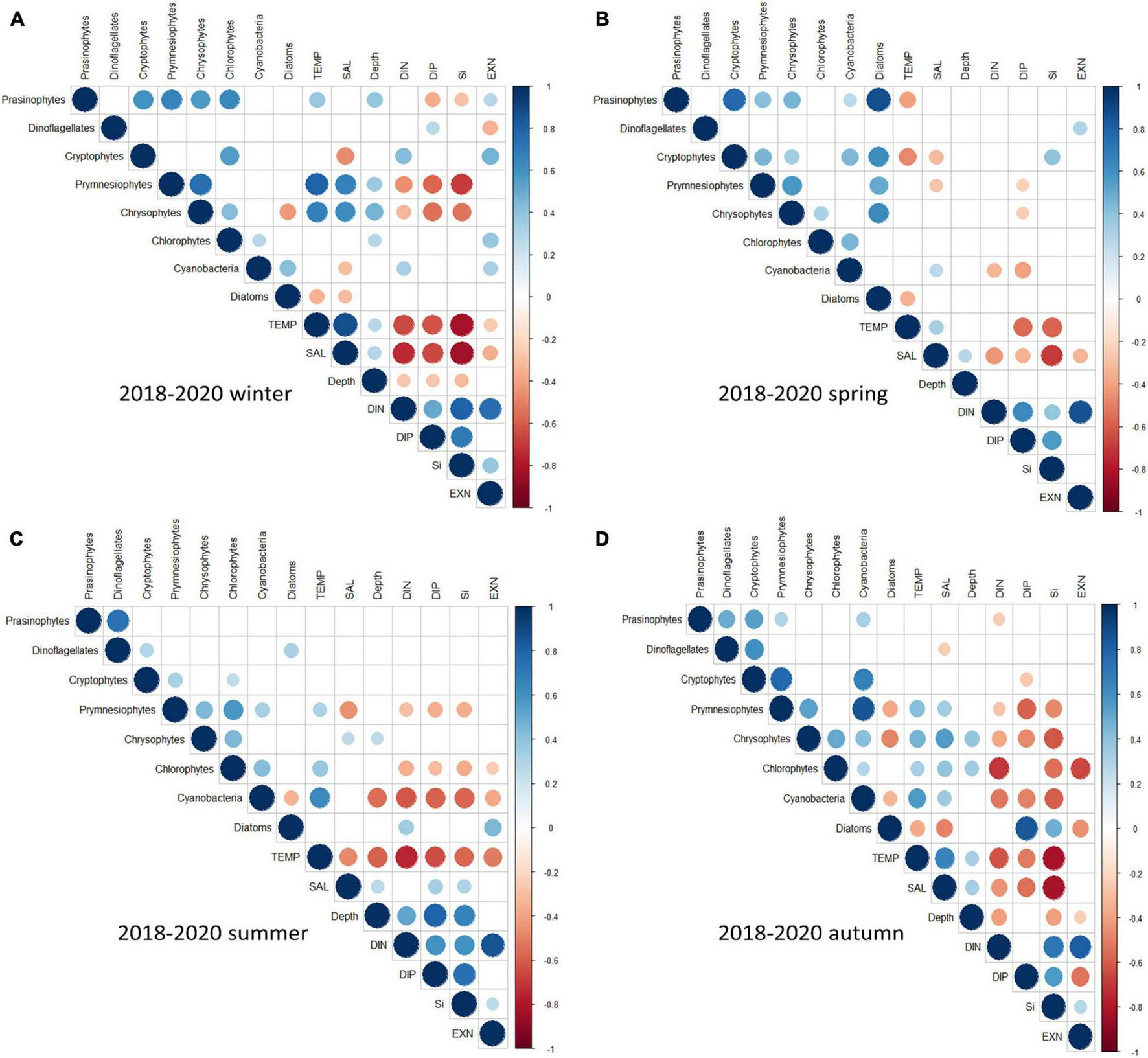 The correlation coefficients between the major phytoplankton communities and environmental drivers for each season are presented in Figure 10.