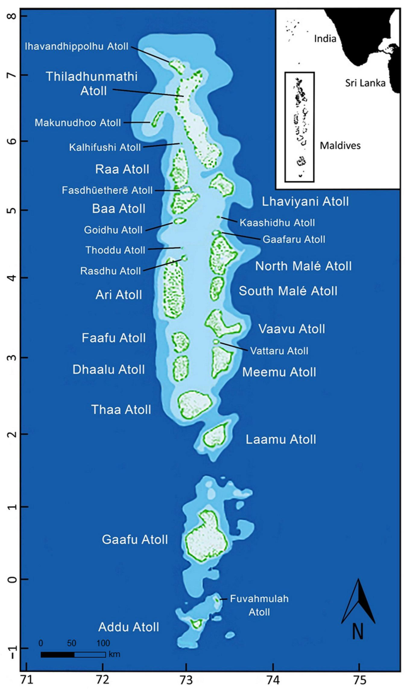 Figure 1. Map of the Maldives archipelago located to the southwest of India. Diagram shows the 26 geographical atolls illustrated in green.