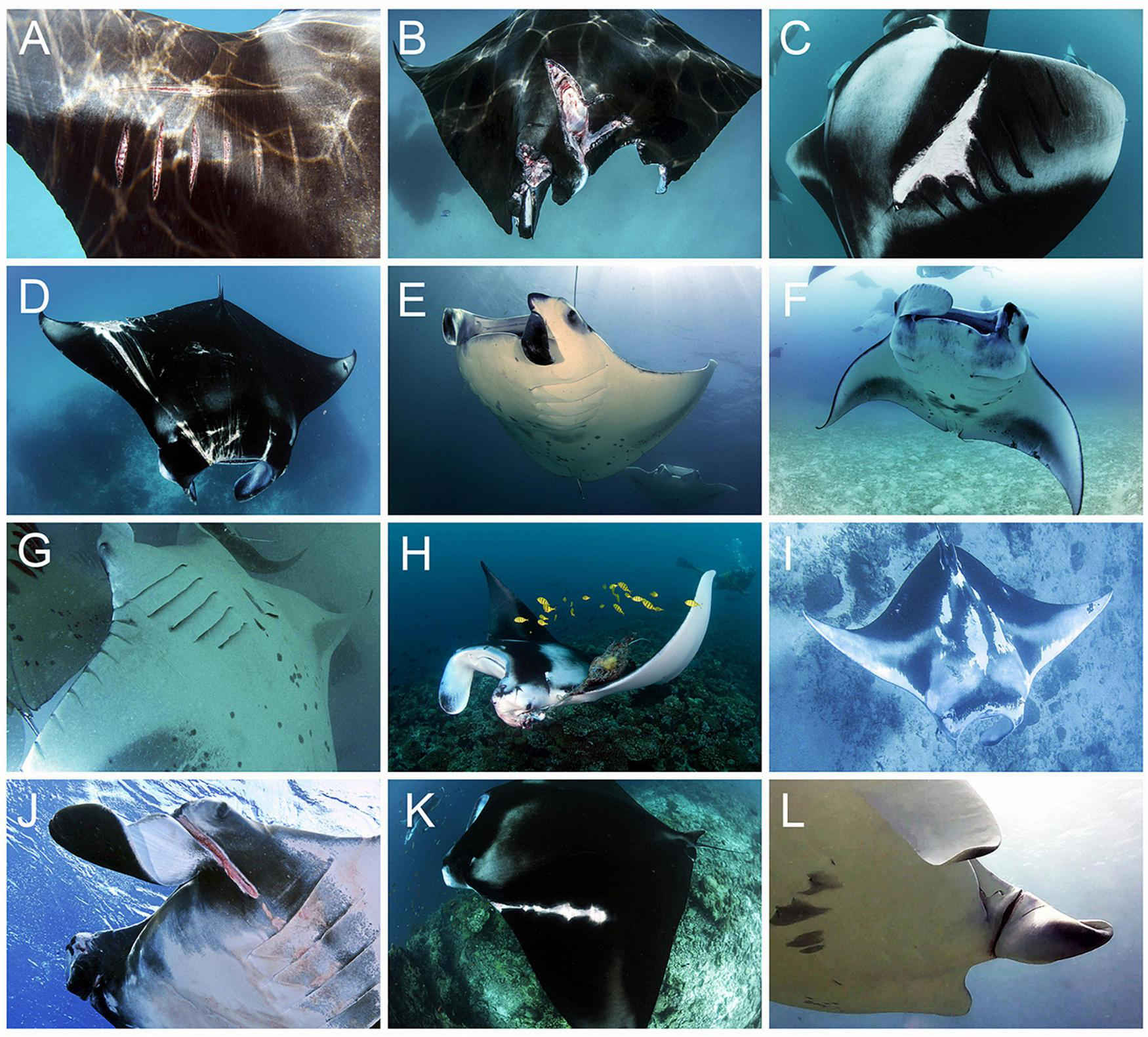 Figure 2. Anthropogenic Mobula alfredi and M. birostris sublethal injury types: (A–C) Boat strike. (A,B) Fresh wounds within days of strike, and (C) several weeks after strike. (D–F) Fishing line/hook. (D) Fresh wound days after line cut free, (E) left cephalic fin three-quarters severed and functionless, and (F) left cephalic fin amputated and scarring around mouth, down gill slits and on trailing edge of left pectoral fin. (G–I) Net entanglement. (G) Regularly spaced gill net scarring down ventral surface of right pectoral fin, (H) ghost net entangled in left cephalic fin, and (I) scarring to entire dorsal body surface, increasing around body edges and extremities. (J–L) Rope entanglement. (J,L) Left cephalic fins with deep laceration (injuries recorded directly after rope was cut free), and (K) large scarring from rope entanglement over left shoulder. All images collected in the Maldives during this study. Images © Manta Trust.