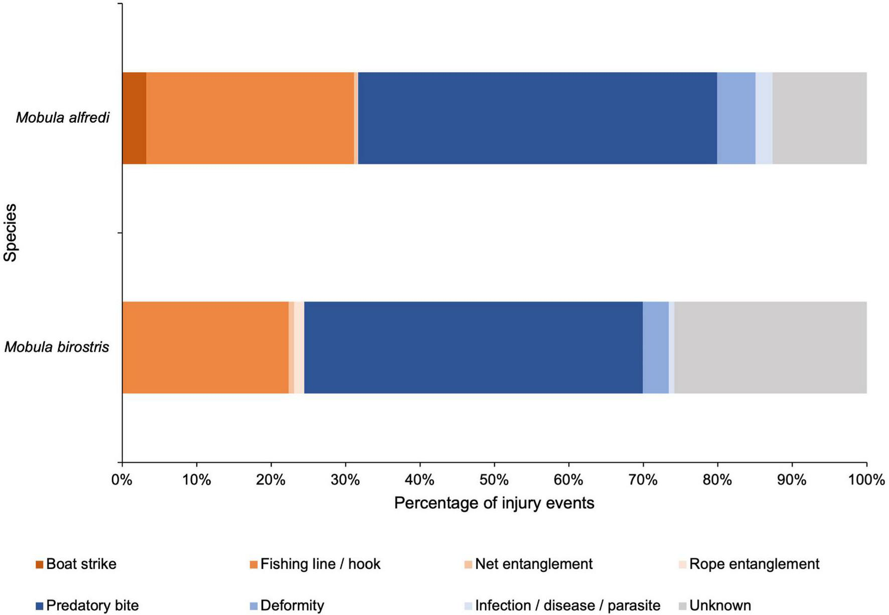 Of the 1,635 injury events recorded for M. alfredi (Figure 4), 207 (13%) were of unknown type and origin, 518 (32%) were of anthropogenic origin, and 910 (55%) originated naturally. Of the identified injury types (n = 1,428), the most frequently observed injuries were predatory bites, with 789 (55%) injury events recorded, while injuries caused by fishing line or hooks accounted for 32% (n = 456) of injury events and were the most frequently observed anthropogenic injury type. A total of 53 (4%) boat strike injury events were also recorded.